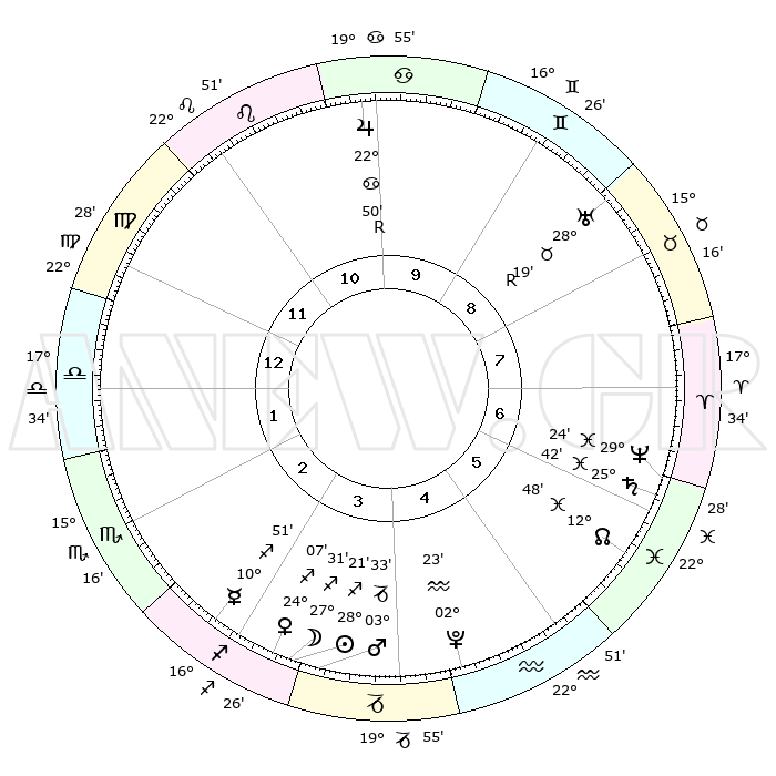 | | ΘΕΣΕΙΣ ΠΛΑΝΗΤΩΝ ΑΣΤΡΟΛΟΓΙΚΟΥ ΧΑΡΤΗ ΤΗΣ ΣΤΙΓΜΗΣ ΑΥΤΗΣ | | | | Πλανήτης | Ζώδιο | Μοίρες | Δεκαήμ. | Σε οίκο | Απόκλιση | | Ακμές των οίκων | | Ηλιος | Τοξότης | 27°27' | Τρίτο | 2 | 23 S 24 | | 1ος | 23°07' | Σκορπιός | | Σελήνη | Τοξότης | 17°01' | Δεύτερο | 1 | 27 S 45 | | 2ος | 23°23' | Τοξότης | | Ερμής | Τοξότης | 09°37' | Πρώτο | 1 | 20 S 53 | | 3ος | 27°60' | Αιγόκερως | | Αφροδίτη | Τοξότης | 23°01' | Τρίτο | 1 | 23 S 15 | | 4ος | 03°46' | Ιχθείς | | Αρης | Αιγόκερως | 02°53' | Πρώτο | 2 | 24 S 12 | | 5ος | 05°34' | Κριός | | Δίας | Καρκίνος | 22°55'R | Τρίτο | 8 | 21 N 41 | | 6ος | 01°33' | Ταύρος | | Κρόνος | Ιχθείς | 25°40' | Τρίτο | 4 | 03 S 50 | | 7ος | 23°07' | Ταύρος | | Ουρανός | Ταύρος | 28°21'R | Τρίτο | 7 | 19 N 35 | | 8ος | 23°23' | Δίδυμοι | | Ποσειδώνας | Ιχθείς | 29°24' | Τρίτο | 4 | 01 S 28 | | 9ος | 27°60' | Καρκίνος | | Πλούτωνας | Υδροχόος | 02°21' | Πρώτο | 3 | 23 S 18 | | 10ος | 03°47' | Παρθένος | | Β. Δεσμός | Ιχθείς | 12°51' | Δεύτερο | 4 | 06 S 44 | | 11ος | 05°34' | Ζυγός | | Ωροσκόπος | Σκορπιός | 23°07' | Τρίτο | | | 12ος | 01°33' | Σκορπιός | | Μεσουράνημα | Παρθένος | 03°47' | Πρώτο | | | |