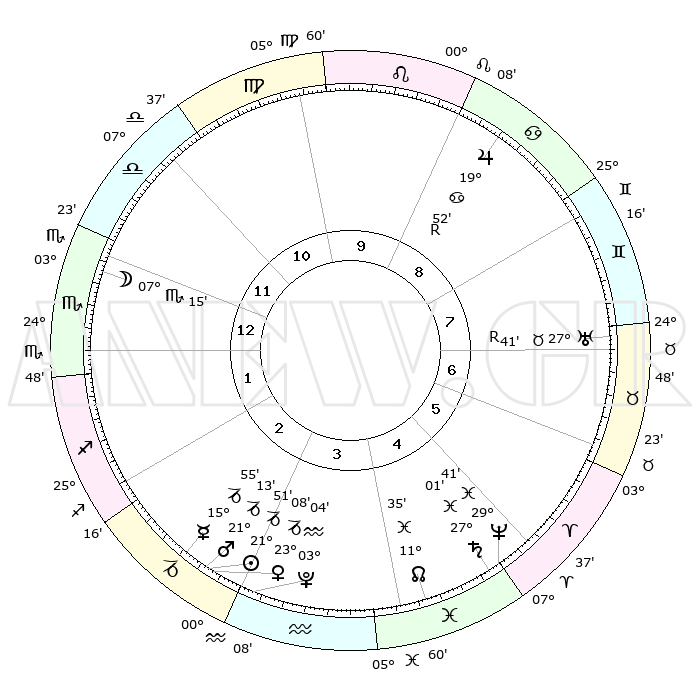 | | ΘΕΣΕΙΣ ΠΛΑΝΗΤΩΝ ΑΣΤΡΟΛΟΓΙΚΟΥ ΧΑΡΤΗ ΤΗΣ ΣΤΙΓΜΗΣ ΑΥΤΗΣ | | | | Πλανήτης | Ζώδιο | Μοίρες | Δεκαήμ. | Σε οίκο | Απόκλιση | | Ακμές των οίκων | | Ηλιος | Αιγόκερως | 21°46' | Τρίτο | 3 | 21 S 40 | | 1ος | 02°03' | Σκορπιός | | Σελήνη | Σκορπιός | 06°19' | Πρώτο | 1 | 17 S 38 | | 2ος | 00°36' | Τοξότης | | Ερμής | Αιγόκερως | 15°48' | Δεύτερο | 3 | 24 S 04 | | 3ος | 02°43' | Αιγόκερως | | Αφροδίτη | Αιγόκερως | 23°02' | Τρίτο | 3 | 22 S 20 | | 4ος | 07°03' | Υδροχόος | | Αρης | Αιγόκερως | 21°09' | Τρίτο | 3 | 22 S 43 | | 5ος | 09°56' | Ιχθείς | | Δίας | Καρκίνος | 19°53'R | Δεύτερο | 9 | 22 N 13 | | 6ος | 08°25' | Κριός | | Κρόνος | Ιχθείς | 27°01' | Τρίτο | 5 | 03 S 14 | | 7ος | 02°03' | Ταύρος | | Ουρανός | Ταύρος | 27°41'R | Τρίτο | 7 | 19 N 27 | | 8ος | 00°36' | Δίδυμοι | | Ποσειδώνας | Ιχθείς | 29°41' | Τρίτο | 5 | 01 S 21 | | 9ος | 02°43' | Καρκίνος | | Πλούτωνας | Υδροχόος | 03°04' | Πρώτο | 3 | 23 S 09 | | 10ος | 07°03' | Λέων | | Β. Δεσμός | Ιχθείς | 11°35' | Δεύτερο | 5 | 07 S 13 | | 11ος | 09°56' | Παρθένος | | Ωροσκόπος | Σκορπιός | 02°03' | Πρώτο | | | 12ος | 08°25' | Ζυγός | | Μεσουράνημα | Λέων | 07°03' | Πρώτο | | | |