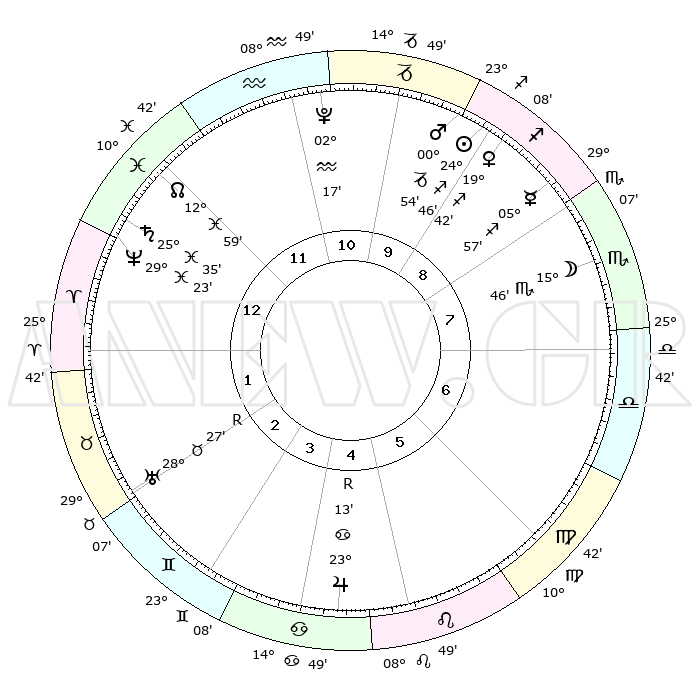 | | ΘΕΣΕΙΣ ΠΛΑΝΗΤΩΝ ΑΣΤΡΟΛΟΓΙΚΟΥ ΧΑΡΤΗ ΤΗΣ ΣΤΙΓΜΗΣ ΑΥΤΗΣ | | | | Πλανήτης | Ζώδιο | Μοίρες | Δεκαήμ. | Σε οίκο | Απόκλιση | | Ακμές των οίκων | | Ηλιος | Τοξότης | 24°25' | Τρίτο | 1 | 23 S 19 | | 1ος | 25°46' | Σκορπιός | | Σελήνη | Σκορπιός | 11°36' | Δεύτερο | 12 | 19 S 23 | | 2ος | 26°21' | Τοξότης | | Ερμής | Τοξότης | 05°28' | Πρώτο | 1 | 19 S 50 | | 3ος | 01°23' | Υδροχόος | | Αφροδίτη | Τοξότης | 19°15' | Δεύτερο | 1 | 22 S 53 | | 4ος | 07°17' | Ιχθείς | | Αρης | Αιγόκερως | 00°38' | Πρώτο | 2 | 24 S 13 | | 5ος | 08°49' | Κριός | | Δίας | Καρκίνος | 23°15'R | Τρίτο | 8 | 21 N 38 | | 6ος | 04°26' | Ταύρος | | Κρόνος | Ιχθείς | 25°34' | Τρίτο | 4 | 03 S 53 | | 7ος | 25°46' | Ταύρος | | Ουρανός | Ταύρος | 28°27'R | Τρίτο | 7 | 19 N 37 | | 8ος | 26°21' | Δίδυμοι | | Ποσειδώνας | Ιχθείς | 29°23' | Τρίτο | 4 | 01 S 29 | | 9ος | 01°23' | Λέων | | Πλούτωνας | Υδροχόος | 02°16' | Πρώτο | 3 | 23 S 19 | | 10ος | 07°17' | Παρθένος | | Β. Δεσμός | Ιχθείς | 13°01' | Δεύτερο | 4 | 06 S 40 | | 11ος | 08°49' | Ζυγός | | Ωροσκόπος | Σκορπιός | 25°46' | Τρίτο | | | 12ος | 04°26' | Σκορπιός | | Μεσουράνημα | Παρθένος | 07°17' | Πρώτο | | | |