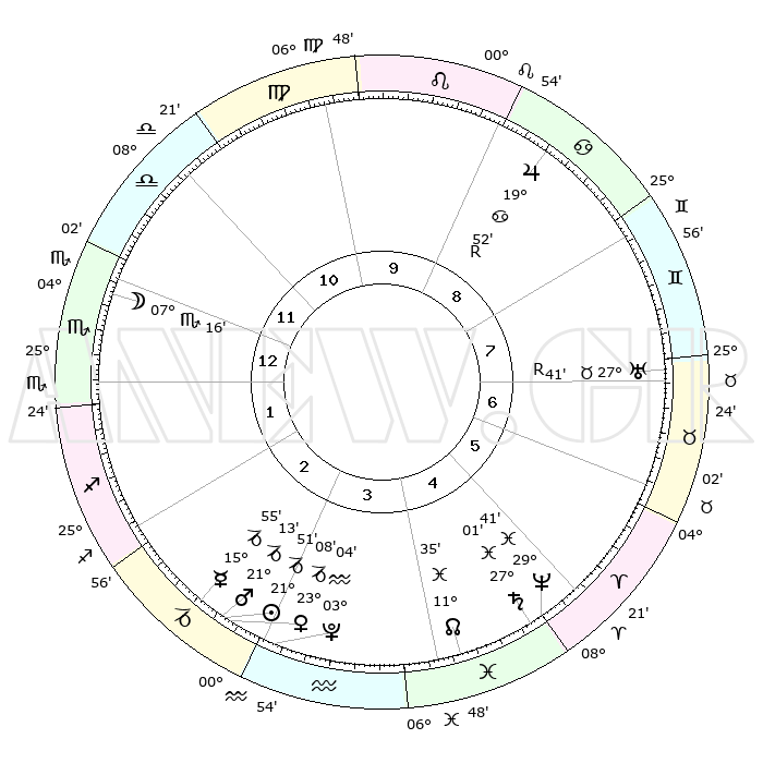 | | ΘΕΣΕΙΣ ΠΛΑΝΗΤΩΝ ΑΣΤΡΟΛΟΓΙΚΟΥ ΧΑΡΤΗ ΤΗΣ ΣΤΙΓΜΗΣ ΑΥΤΗΣ | | | | Πλανήτης | Ζώδιο | Μοίρες | Δεκαήμ. | Σε οίκο | Απόκλιση | | Ακμές των οίκων | | Ηλιος | Αιγόκερως | 21°46' | Τρίτο | 3 | 21 S 40 | | 1ος | 01°51' | Σκορπιός | | Σελήνη | Σκορπιός | 06°18' | Πρώτο | 1 | 17 S 38 | | 2ος | 00°23' | Τοξότης | | Ερμής | Αιγόκερως | 15°47' | Δεύτερο | 3 | 24 S 04 | | 3ος | 02°29' | Αιγόκερως | | Αφροδίτη | Αιγόκερως | 23°02' | Τρίτο | 3 | 22 S 20 | | 4ος | 06°48' | Υδροχόος | | Αρης | Αιγόκερως | 21°09' | Τρίτο | 3 | 22 S 43 | | 5ος | 09°42' | Ιχθείς | | Δίας | Καρκίνος | 19°53'R | Δεύτερο | 9 | 22 N 13 | | 6ος | 08°12' | Κριός | | Κρόνος | Ιχθείς | 27°01' | Τρίτο | 5 | 03 S 14 | | 7ος | 01°51' | Ταύρος | | Ουρανός | Ταύρος | 27°41'R | Τρίτο | 7 | 19 N 27 | | 8ος | 00°23' | Δίδυμοι | | Ποσειδώνας | Ιχθείς | 29°41' | Τρίτο | 5 | 01 S 21 | | 9ος | 02°29' | Καρκίνος | | Πλούτωνας | Υδροχόος | 03°04' | Πρώτο | 3 | 23 S 09 | | 10ος | 06°48' | Λέων | | Β. Δεσμός | Ιχθείς | 11°35' | Δεύτερο | 5 | 07 S 13 | | 11ος | 09°42' | Παρθένος | | Ωροσκόπος | Σκορπιός | 01°51' | Πρώτο | | | 12ος | 08°12' | Ζυγός | | Μεσουράνημα | Λέων | 06°48' | Πρώτο | | | |