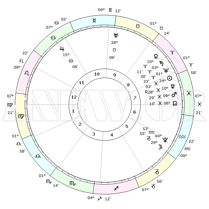 | | ΘΕΣΕΙΣ ΠΛΑΝΗΤΩΝ ΑΣΤΡΟΛΟΓΙΚΟΥ ΧΑΡΤΗ ΤΗΣ ΣΤΙΓΜΗΣ ΑΥΤΗΣ | | | | Πλανήτης | Ζώδιο | Μοίρες | Δεκαήμ. | Σε οίκο | Απόκλιση | | Ακμές των οίκων | | Ηλιος | Ιχθείς | 23°59' | Τρίτο | 8 | 02 S 23 | | 1ος | 17°34' | Λέων | | Σελήνη | Αιγόκερως | 29°04' | Τρίτο | 6 | 23 S 39 | | 2ος | 10°08' | Παρθένος | | Ερμής | Ιχθείς | 10°31'R | Δεύτερο | 8 | 05 S 18 | | 3ος | 07°29' | Ζυγός | | Αφροδίτη | Κριός | 10°05' | Δεύτερο | 9 | 03 N 01 | | 4ος | 10°03' | Σκορπιός | | Αρης | Ιχθείς | 09°26' | Πρώτο | 7 | 09 S 02 | | 5ος | 15°08' | Τοξότης | | Δίας | Καρκίνος | 15°06' | Δεύτερο | 11 | 22 N 56 | | 6ος | 18°19' | Αιγόκερως | | Κρόνος | Κριός | 03°29' | Πρώτο | 8 | 00 S 34 | | 7ος | 17°34' | Υδροχόος | | Ουρανός | Ταύρος | 28°06' | Τρίτο | 10 | 19 N 34 | | 8ος | 10°08' | Ιχθείς | | Ποσειδώνας | Κριός | 01°33' | Πρώτο | 8 | 00 S 35 | | 9ος | 07°29' | Κριός | | Πλούτωνας | Υδροχόος | 04°53' | Πρώτο | 6 | 22 S 50 | | 10ος | 10°03' | Ταύρος | | Β. Δεσμός | Ιχθείς | 08°20' | Πρώτο | 7 | 08 S 27 | | 11ος | 15°08' | Δίδυμοι | | Ωροσκόπος | Λέων | 17°34' | Δεύτερο | | | 12ος | 18°19' | Καρκίνος | | Μεσουράνημα | Ταύρος | 10°03' | Δεύτερο | | | |