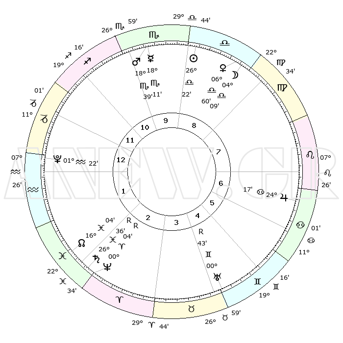 | ΘΕΣΕΙΣ ΠΛΑΝΗΤΩΝ ΑΣΤΡΟΛΟΓΙΚΟΥ ΧΑΡΤΗ ΤΗΣ ΣΤΙΓΜΗΣ ΑΥΤΗΣ | | Πλανήτης | Ζώδιο | Μοίρες | Δεκαήμ. | Σε οίκο | Απόκλιση | | Ακμές των οίκων | Ηλιος | Ζυγός | 26°16' | Τρίτο | 10 | 10 S 08 | | 1ος | 00°19' | Αιγόκερως | Σελήνη | Ζυγός | 02°58' | Πρώτο | 9 | 02 S 25 | | 2ος | 07°33' | Υδροχόος | Ερμής | Σκορπιός | 18°03' | Δεύτερο | 11 | 19 S 17 | | 3ος | 17°35' | Ιχθείς | Αφροδίτη | Ζυγός | 06°53' | Πρώτο | 9 | 01 S 19 | | 4ος | 21°28' | Κριός | Αρης | Σκορπιός | 18°35' | Δεύτερο | 11 | 17 S 37 | | 5ος | 17°44' | Ταύρος | Δίας | Καρκίνος | 24°17' | Τρίτο | 7 | 21 N 19 | | 6ος | 09°31' | Δίδυμοι | Κρόνος | Ιχθείς | 26°36'R | Τρίτο | 3 | 03 S 38 | | 7ος | 00°19' | Καρκίνος | Ουρανός | Δίδυμοι | 00°43'R | Πρώτο | 5 | 20 N 05 | | 8ος | 07°33' | Λέων | Ποσειδώνας | Κριός | 00°04'R | Πρώτο | 3 | 01 S 14 | | 9ος | 17°35' | Παρθένος | Πλούτωνας | Υδροχόος | 01°22' | Πρώτο | 1 | 23 S 32 | | 10ος | 21°28' | Ζυγός | Β. Δεσμός | Ιχθείς | 16°04' | Δεύτερο | 2 | 05 S 30 | | 11ος | 17°44' | Σκορπιός | Ωροσκόπος | Αιγόκερως | 00°19' | Πρώτο | | | 12ος | 09°31' | Τοξότης | Μεσουράνημα | Ζυγός | 21°28' | Τρίτο | | | |