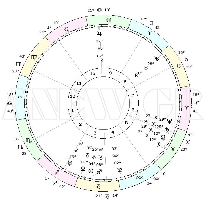 | | ΘΕΣΕΙΣ ΠΛΑΝΗΤΩΝ ΑΣΤΡΟΛΟΓΙΚΟΥ ΧΑΡΤΗ ΤΗΣ ΣΤΙΓΜΗΣ ΑΥΤΗΣ | | | | Πλανήτης | Ζώδιο | Μοίρες | Δεκαήμ. | Σε οίκο | Απόκλιση | | Ακμές των οίκων | | Ηλιος | Αιγόκερως | 04°22' | Πρώτο | 4 | 23 S 22 | | 1ος | 26°37' | Παρθένος | | Σελήνη | Ιχθείς | 11°08' | Δεύτερο | 6 | 07 S 24 | | 2ος | 22°58' | Ζυγός | | Ερμής | Τοξότης | 19°29' | Δεύτερο | 3 | 22 S 52 | | 3ος | 23°16' | Σκορπιός | | Αφροδίτη | Αιγόκερως | 01°33' | Πρώτο | 4 | 23 S 42 | | 4ος | 26°13' | Τοξότης | | Αρης | Αιγόκερως | 08°03' | Πρώτο | 4 | 24 S 02 | | 5ος | 29°14' | Αιγόκερως | | Δίας | Καρκίνος | 22°08'R | Τρίτο | 10 | 21 N 50 | | 6ος | 29°48' | Υδροχόος | | Κρόνος | Ιχθείς | 25°58' | Τρίτο | 6 | 03 S 42 | | 7ος | 26°37' | Ιχθείς | | Ουρανός | Ταύρος | 28°07'R | Τρίτο | 9 | 19 N 33 | | 8ος | 22°58' | Κριός | | Ποσειδώνας | Ιχθείς | 29°27' | Τρίτο | 7 | 01 S 27 | | 9ος | 23°16' | Ταύρος | | Πλούτωνας | Υδροχόος | 02°33' | Πρώτο | 5 | 23 S 15 | | 10ος | 26°13' | Δίδυμοι | | Β. Δεσμός | Ιχθείς | 12°30' | Δεύτερο | 6 | 06 S 52 | | 11ος | 29°14' | Καρκίνος | | Ωροσκόπος | Παρθένος | 26°37' | Τρίτο | | | 12ος | 29°48' | Λέων | | Μεσουράνημα | Δίδυμοι | 26°13' | Τρίτο | | | |