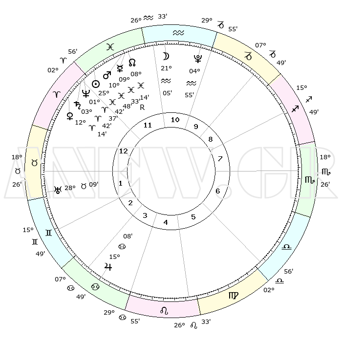 | | ΘΕΣΕΙΣ ΠΛΑΝΗΤΩΝ ΑΣΤΡΟΛΟΓΙΚΟΥ ΧΑΡΤΗ ΤΗΣ ΣΤΙΓΜΗΣ ΑΥΤΗΣ | | | | Πλανήτης | Ζώδιο | Μοίρες | Δεκαήμ. | Σε οίκο | Απόκλιση | | Ακμές των οίκων | | Ηλιος | Ιχθείς | 25°39' | Τρίτο | 12 | 01 S 44 | | 1ος | 16°16' | Κριός | | Σελήνη | Υδροχόος | 20°17' | Τρίτο | 11 | 16 S 20 | | 2ος | 22°18' | Ταύρος | | Ερμής | Ιχθείς | 09°34'R | Πρώτο | 12 | 06 S 01 | | 3ος | 17°26' | Δίδυμοι | | Αφροδίτη | Κριός | 12°10' | Δεύτερο | 12 | 03 N 53 | | 4ος | 09°13' | Καρκίνος | | Αρης | Ιχθείς | 10°45' | Δεύτερο | 12 | 08 S 32 | | 5ος | 02°28' | Λέων | | Δίας | Καρκίνος | 15°08' | Δεύτερο | 4 | 22 N 56 | | 6ος | 02°34' | Παρθένος | | Κρόνος | Κριός | 03°42' | Πρώτο | 12 | 00 S 29 | | 7ος | 16°16' | Ζυγός | | Ουρανός | Ταύρος | 28°09' | Τρίτο | 2 | 19 N 34 | | 8ος | 22°18' | Σκορπιός | | Ποσειδώνας | Κριός | 01°37' | Πρώτο | 12 | 00 S 33 | | 9ος | 17°26' | Τοξότης | | Πλούτωνας | Υδροχόος | 04°55' | Πρώτο | 11 | 22 S 49 | | 10ος | 09°13' | Αιγόκερως | | Β. Δεσμός | Ιχθείς | 08°14' | Πρώτο | 12 | 08 S 29 | | 11ος | 02°28' | Υδροχόος | | Ωροσκόπος | Κριός | 16°16' | Δεύτερο | | | 12ος | 02°34' | Ιχθείς | | Μεσουράνημα | Αιγόκερως | 09°13' | Πρώτο | | | |