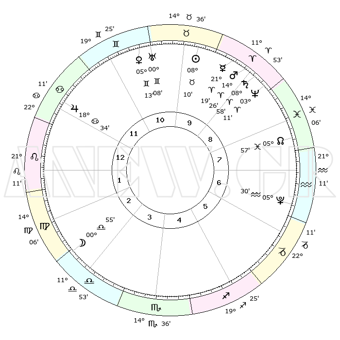 | | ΘΕΣΕΙΣ ΠΛΑΝΗΤΩΝ ΑΣΤΡΟΛΟΓΙΚΟΥ ΧΑΡΤΗ ΤΗΣ ΣΤΙΓΜΗΣ ΑΥΤΗΣ | | | | Πλανήτης | Ζώδιο | Μοίρες | Δεκαήμ. | Σε οίκο | Απόκλιση | | Ακμές των οίκων | | Ηλιος | Ταύρος | 08°07' | Πρώτο | 10 | 14 N 13 | | 1ος | 06°18' | Λέων | | Σελήνη | Ζυγός | 00°17' | Πρώτο | 3 | 01 S 56 | | 2ος | 27°48' | Λέων | | Ερμής | Κριός | 21°14' | Τρίτο | 9 | 06 N 15 | | 3ος | 23°43' | Παρθένος | | Αφροδίτη | Δίδυμοι | 05°09' | Πρώτο | 11 | 21 N 55 | | 4ος | 25°27' | Ζυγός | | Αρης | Κριός | 14°23' | Δεύτερο | 9 | 04 N 50 | | 5ος | 01°15' | Τοξότης | | Δίας | Καρκίνος | 18°34' | Δεύτερο | 12 | 22 N 32 | | 6ος | 05°58' | Αιγόκερως | | Κρόνος | Κριός | 08°58' | Πρώτο | 9 | 01 N 34 | | 7ος | 06°18' | Υδροχόος | | Ουρανός | Δίδυμοι | 00°08' | Πρώτο | 10 | 20 N 01 | | 8ος | 27°48' | Υδροχόος | | Ποσειδώνας | Κριός | 03°11' | Πρώτο | 9 | 00 N 03 | | 9ος | 23°43' | Ιχθείς | | Πλούτωνας | Υδροχόος | 05°30' | Πρώτο | 6 | 22 S 48 | | 10ος | 25°27' | Κριός | | Β. Δεσμός | Ιχθείς | 05°57' | Πρώτο | 8 | 09 S 20 | | 11ος | 01°15' | Δίδυμοι | | Ωροσκόπος | Λέων | 06°18' | Πρώτο | | | 12ος | 05°58' | Καρκίνος | | Μεσουράνημα | Κριός | 25°27' | Τρίτο | | | |