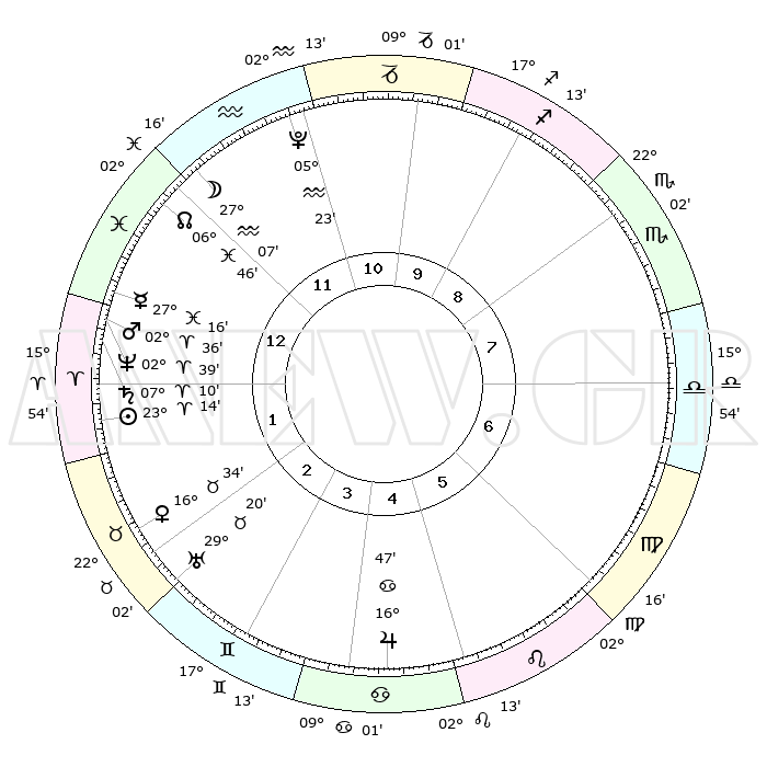 | | ΘΕΣΕΙΣ ΠΛΑΝΗΤΩΝ ΑΣΤΡΟΛΟΓΙΚΟΥ ΧΑΡΤΗ ΤΗΣ ΣΤΙΓΜΗΣ ΑΥΤΗΣ | | | | Πλανήτης | Ζώδιο | Μοίρες | Δεκαήμ. | Σε οίκο | Απόκλιση | | Ακμές των οίκων | | Ηλιος | Κριός | 23°10' | Τρίτο | 2 | 09 N 00 | | 1ος | 06°20' | Ιχθείς | | Σελήνη | Υδροχόος | 26°14' | Τρίτο | 12 | 13 S 46 | | 2ος | 21°06' | Κριός | | Ερμής | Ιχθείς | 27°11' | Τρίτο | 1 | 03 S 26 | | 3ος | 22°36' | Ταύρος | | Αφροδίτη | Ταύρος | 16°29' | Δεύτερο | 2 | 16 N 51 | | 4ος | 16°25' | Δίδυμοι | | Αρης | Κριός | 02°33' | Πρώτο | 1 | 00 N 06 | | 5ος | 08°06' | Καρκίνος | | Δίας | Καρκίνος | 16°46' | Δεύτερο | 5 | 22 N 45 | | 6ος | 02°21' | Λέων | | Κρόνος | Κριός | 07°09' | Πρώτο | 1 | 00 N 52 | | 7ος | 06°20' | Παρθένος | | Ουρανός | Ταύρος | 29°20' | Τρίτο | 3 | 19 N 50 | | 8ος | 21°06' | Ζυγός | | Ποσειδώνας | Κριός | 02°39' | Πρώτο | 1 | 00 S 09 | | 9ος | 22°36' | Σκορπιός | | Πλούτωνας | Υδροχόος | 05°23' | Πρώτο | 12 | 22 S 47 | | 10ος | 16°25' | Τοξότης | | Β. Δεσμός | Ιχθείς | 06°46' | Πρώτο | 1 | 09 S 02 | | 11ος | 08°06' | Αιγόκερως | | Ωροσκόπος | Ιχθείς | 06°20' | Πρώτο | | | 12ος | 02°21' | Υδροχόος | | Μεσουράνημα | Τοξότης | 16°25' | Δεύτερο | | | |