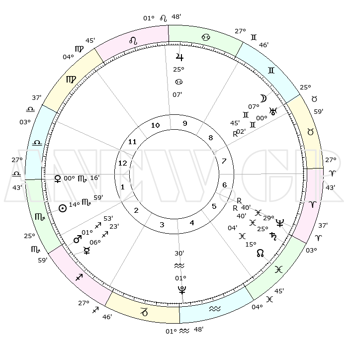 | | ΘΕΣΕΙΣ ΠΛΑΝΗΤΩΝ ΑΣΤΡΟΛΟΓΙΚΟΥ ΧΑΡΤΗ ΤΗΣ ΣΤΙΓΜΗΣ ΑΥΤΗΣ | | | | Πλανήτης | Ζώδιο | Μοίρες | Δεκαήμ. | Σε οίκο | Απόκλιση | | Ακμές των οίκων | | Ηλιος | Σκορπιός | 14°53' | Δεύτερο | 2 | 16 S 18 | | 1ος | 27°31' | Παρθένος | | Σελήνη | Δίδυμοι | 06°11' | Πρώτο | 9 | 26 N 15 | | 2ος | 23°55' | Ζυγός | | Ερμής | Τοξότης | 06°21' | Πρώτο | 3 | 24 S 00 | | 3ος | 24°15' | Σκορπιός | | Αφροδίτη | Σκορπιός | 00°08' | Πρώτο | 2 | 10 S 13 | | 4ος | 27°12' | Τοξότης | | Αρης | Τοξότης | 01°48' | Πρώτο | 3 | 20 S 57 | | 5ος | 00°13' | Υδροχόος | | Δίας | Καρκίνος | 25°07' | Τρίτο | 10 | 21 N 12 | | 6ος | 00°45' | Ιχθείς | | Κρόνος | Ιχθείς | 25°41'R | Τρίτο | 6 | 03 S 58 | | 7ος | 27°31' | Ιχθείς | | Ουρανός | Δίδυμοι | 00°02'R | Πρώτο | 9 | 19 N 57 | | 8ος | 23°55' | Κριός | | Ποσειδώνας | Ιχθείς | 29°41'R | Τρίτο | 7 | 01 S 23 | | 9ος | 24°15' | Ταύρος | | Πλούτωνας | Υδροχόος | 01°30' | Πρώτο | 5 | 23 S 30 | | 10ος | 27°12' | Δίδυμοι | | Β. Δεσμός | Ιχθείς | 15°05' | Δεύτερο | 6 | 05 S 53 | | 11ος | 00°13' | Λέων | | Ωροσκόπος | Παρθένος | 27°31' | Τρίτο | | | 12ος | 00°45' | Παρθένος | | Μεσουράνημα | Δίδυμοι | 27°12' | Τρίτο | | | |