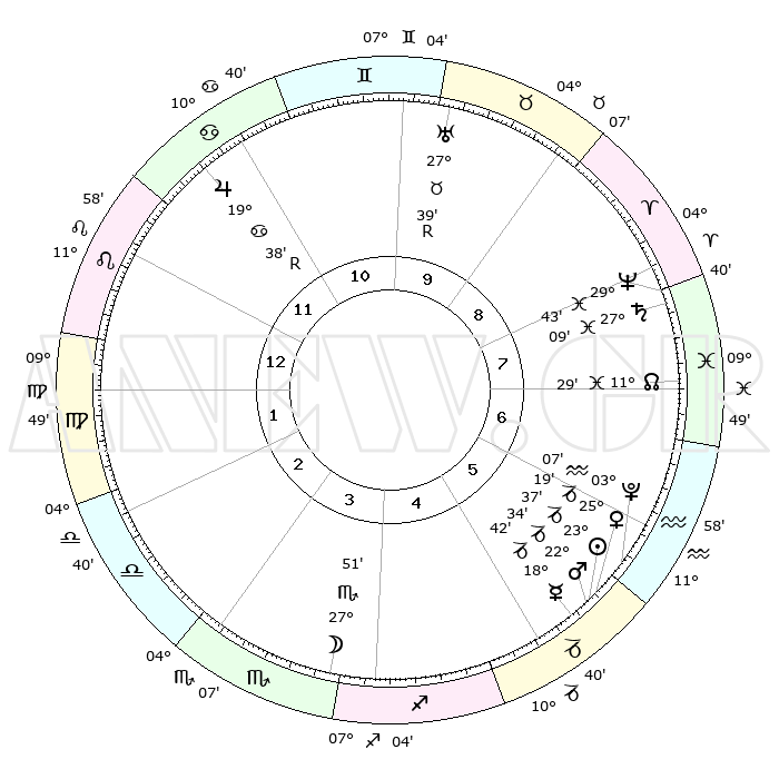| | ΘΕΣΕΙΣ ΠΛΑΝΗΤΩΝ ΑΣΤΡΟΛΟΓΙΚΟΥ ΧΑΡΤΗ ΤΗΣ ΣΤΙΓΜΗΣ ΑΥΤΗΣ | | | | Πλανήτης | Ζώδιο | Μοίρες | Δεκαήμ. | Σε οίκο | Απόκλιση | | Ακμές των οίκων | | Ηλιος | Αιγόκερως | 23°33' | Τρίτο | 6 | 21 S 23 | | 1ος | 19°24' | Λέων | | Σελήνη | Σκορπιός | 27°01' | Τρίτο | 4 | 24 S 20 | | 2ος | 12°09' | Παρθένος | | Ερμής | Αιγόκερως | 18°36' | Δεύτερο | 5 | 23 S 50 | | 3ος | 09°43' | Ζυγός | | Αφροδίτη | Αιγόκερως | 25°14' | Τρίτο | 6 | 22 S 01 | | 4ος | 12°22' | Σκορπιός | | Αρης | Αιγόκερως | 22°30' | Τρίτο | 6 | 22 S 30 | | 5ος | 17°19' | Τοξότης | | Δίας | Καρκίνος | 19°39'R | Δεύτερο | 11 | 22 N 16 | | 6ος | 20°17' | Αιγόκερως | | Κρόνος | Ιχθείς | 27°09' | Τρίτο | 8 | 03 S 10 | | 7ος | 19°24' | Υδροχόος | | Ουρανός | Ταύρος | 27°39'R | Τρίτο | 10 | 19 N 27 | | 8ος | 12°09' | Ιχθείς | | Ποσειδώνας | Ιχθείς | 29°43' | Τρίτο | 8 | 01 S 20 | | 9ος | 09°43' | Κριός | | Πλούτωνας | Υδροχόος | 03°07' | Πρώτο | 6 | 23 S 08 | | 10ος | 12°22' | Ταύρος | | Β. Δεσμός | Ιχθείς | 11°30' | Δεύτερο | 7 | 07 S 15 | | 11ος | 17°19' | Δίδυμοι | | Ωροσκόπος | Λέων | 19°24' | Δεύτερο | | | 12ος | 20°17' | Καρκίνος | | Μεσουράνημα | Ταύρος | 12°22' | Δεύτερο | | | |