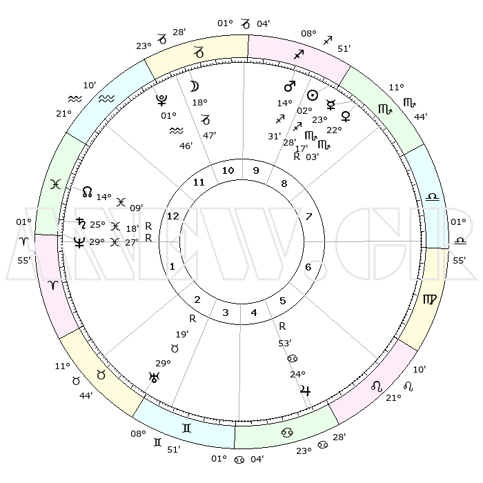 | | ΘΕΣΕΙΣ ΠΛΑΝΗΤΩΝ ΑΣΤΡΟΛΟΓΙΚΟΥ ΧΑΡΤΗ ΤΗΣ ΣΤΙΓΜΗΣ ΑΥΤΗΣ | | | | Πλανήτης | Ζώδιο | Μοίρες | Δεκαήμ. | Σε οίκο | Απόκλιση | | Ακμές των οίκων | | Ηλιος | Τοξότης | 02°25' | Πρώτο | 9 | 20 S 38 | | 1ος | 00°04' | Ιχθείς | | Σελήνη | Αιγόκερως | 18°07' | Δεύτερο | 11 | 26 S 21 | | 2ος | 15°29' | Κριός | | Ερμής | Σκορπιός | 23°20'R | Τρίτο | 9 | 16 S 54 | | 3ος | 18°11' | Ταύρος | | Αφροδίτη | Σκορπιός | 21°59' | Τρίτο | 9 | 17 S 22 | | 4ος | 12°35' | Δίδυμοι | | Αρης | Τοξότης | 14°28' | Δεύτερο | 10 | 23 S 08 | | 5ος | 04°16' | Καρκίνος | | Δίας | Καρκίνος | 24°53'R | Τρίτο | 5 | 21 N 17 | | 6ος | 27°50' | Καρκίνος | | Κρόνος | Ιχθείς | 25°18'R | Τρίτο | 1 | 04 S 04 | | 7ος | 00°04' | Παρθένος | | Ουρανός | Ταύρος | 29°19'R | Τρίτο | 3 | 19 N 48 | | 8ος | 15°29' | Ζυγός | | Ποσειδώνας | Ιχθείς | 29°27'R | Τρίτο | 1 | 01 S 28 | | 9ος | 18°11' | Σκορπιός | | Πλούτωνας | Υδροχόος | 01°46' | Πρώτο | 12 | 23 S 26 | | 10ος | 12°34' | Τοξότης | | Β. Δεσμός | Ιχθείς | 14°09' | Δεύτερο | 1 | 06 S 14 | | 11ος | 04°16' | Αιγόκερως | | Ωροσκόπος | Ιχθείς | 00°04' | Πρώτο | | | 12ος | 27°50' | Αιγόκερως | | Μεσουράνημα | Τοξότης | 12°34' | Δεύτερο | | | |