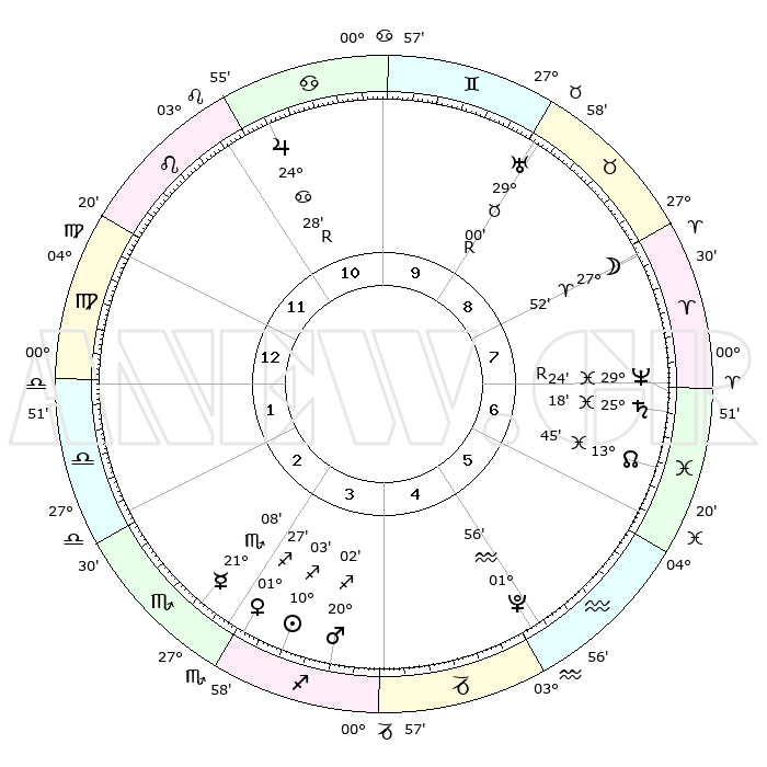 | | ΘΕΣΕΙΣ ΠΛΑΝΗΤΩΝ ΑΣΤΡΟΛΟΓΙΚΟΥ ΧΑΡΤΗ ΤΗΣ ΣΤΙΓΜΗΣ ΑΥΤΗΣ | | | | Πλανήτης | Ζώδιο | Μοίρες | Δεκαήμ. | Σε οίκο | Απόκλιση | | Ακμές των οίκων | | Ηλιος | Τοξότης | 10°01' | Δεύτερο | 3 | 21 S 57 | | 1ος | 23°04' | Παρθένος | | Σελήνη | Κριός | 27°29' | Τρίτο | 8 | 13 N 47 | | 2ος | 19°07' | Ζυγός | | Ερμής | Σκορπιός | 21°08' | Τρίτο | 3 | 15 S 31 | | 3ος | 19°17' | Σκορπιός | | Αφροδίτη | Τοξότης | 01°25' | Πρώτο | 3 | 19 S 47 | | 4ος | 22°12' | Τοξότης | | Αρης | Τοξότης | 20°01' | Τρίτο | 3 | 23 S 44 | | 5ος | 25°18' | Αιγόκερως | | Δίας | Καρκίνος | 24°28'R | Τρίτο | 10 | 21 N 23 | | 6ος | 26°00' | Υδροχόος | | Κρόνος | Ιχθείς | 25°18' | Τρίτο | 7 | 04 S 03 | | 7ος | 23°04' | Ιχθείς | | Ουρανός | Ταύρος | 29°00'R | Τρίτο | 9 | 19 N 44 | | 8ος | 19°07' | Κριός | | Ποσειδώνας | Ιχθείς | 29°24'R | Τρίτο | 7 | 01 S 29 | | 9ος | 19°16' | Ταύρος | | Πλούτωνας | Υδροχόος | 01°56' | Πρώτο | 5 | 23 S 24 | | 10ος | 22°12' | Δίδυμοι | | Β. Δεσμός | Ιχθείς | 13°46' | Δεύτερο | 6 | 06 S 23 | | 11ος | 25°18' | Καρκίνος | | Ωροσκόπος | Παρθένος | 23°04' | Τρίτο | | | 12ος | 26°00' | Λέων | | Μεσουράνημα | Δίδυμοι | 22°12' | Τρίτο | | | |
