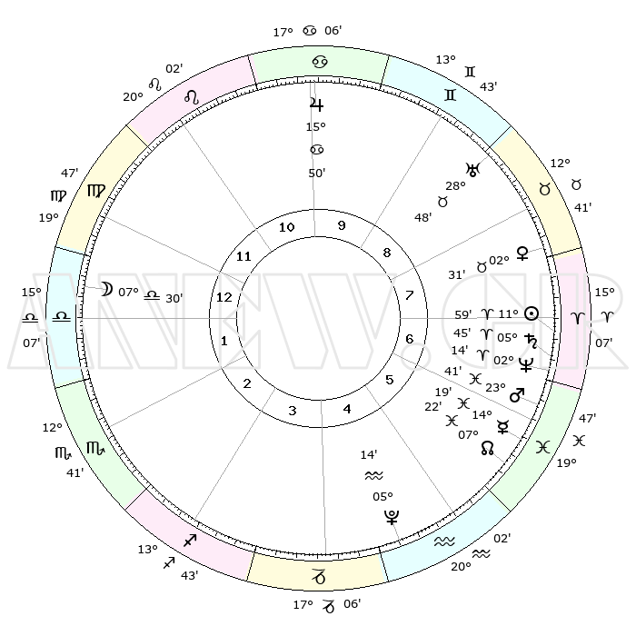 | | ΘΕΣΕΙΣ ΠΛΑΝΗΤΩΝ ΑΣΤΡΟΛΟΓΙΚΟΥ ΧΑΡΤΗ ΤΗΣ ΣΤΙΓΜΗΣ ΑΥΤΗΣ | | | | Πλανήτης | Ζώδιο | Μοίρες | Δεκαήμ. | Σε οίκο | Απόκλιση | | Ακμές των οίκων | | Ηλιος | Κριός | 11°55' | Δεύτερο | 7 | 04 N 43 | | 1ος | 26°18' | Παρθένος | | Σελήνη | Ζυγός | 06°42' | Πρώτο | 1 | 04 S 54 | | 2ος | 22°36' | Ζυγός | | Ερμής | Ιχθείς | 14°15' | Δεύτερο | 6 | 07 S 29 | | 3ος | 22°54' | Σκορπιός | | Αφροδίτη | Ταύρος | 02°27' | Πρώτο | 8 | 11 N 56 | | 4ος | 25°50' | Τοξότης | | Αρης | Ιχθείς | 23°38' | Τρίτο | 6 | 03 S 29 | | 5ος | 28°52' | Αιγόκερως | | Δίας | Καρκίνος | 15°49' | Δεύτερο | 10 | 22 N 52 | | 6ος | 29°27' | Υδροχόος | | Κρόνος | Κριός | 05°45' | Πρώτο | 7 | 00 N 19 | | 7ος | 26°18' | Ιχθείς | | Ουρανός | Ταύρος | 28°48' | Τρίτο | 9 | 19 N 43 | | 8ος | 22°36' | Κριός | | Ποσειδώνας | Κριός | 02°14' | Πρώτο | 7 | 00 S 19 | | 9ος | 22°54' | Ταύρος | | Πλούτωνας | Υδροχόος | 05°14' | Πρώτο | 5 | 22 S 47 | | 10ος | 25°50' | Δίδυμοι | | Β. Δεσμός | Ιχθείς | 07°22' | Πρώτο | 6 | 08 S 48 | | 11ος | 28°52' | Καρκίνος | | Ωροσκόπος | Παρθένος | 26°18' | Τρίτο | | | 12ος | 29°27' | Λέων | | Μεσουράνημα | Δίδυμοι | 25°50' | Τρίτο | | | |