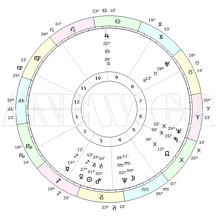 | | ΘΕΣΕΙΣ ΠΛΑΝΗΤΩΝ ΑΣΤΡΟΛΟΓΙΚΟΥ ΧΑΡΤΗ ΤΗΣ ΣΤΙΓΜΗΣ ΑΥΤΗΣ | | | | Πλανήτης | Ζώδιο | Μοίρες | Δεκαήμ. | Σε οίκο | Απόκλιση | | Ακμές των οίκων | | Ηλιος | Αιγόκερως | 01°19' | Πρώτο | 4 | 23 S 26 | | 1ος | 26°28' | Παρθένος | | Σελήνη | Υδροχόος | 03°11' | Πρώτο | 5 | 22 S 29 | | 2ος | 22°47' | Ζυγός | | Ερμής | Τοξότης | 15°04' | Δεύτερο | 3 | 22 S 05 | | 3ος | 23°05' | Σκορπιός | | Αφροδίτη | Τοξότης | 27°47' | Τρίτο | 4 | 23 S 34 | | 4ος | 26°02' | Τοξότης | | Αρης | Αιγόκερως | 05°46' | Πρώτο | 4 | 24 S 08 | | 5ος | 29°03' | Αιγόκερως | | Δίας | Καρκίνος | 22°29'R | Τρίτο | 10 | 21 N 46 | | 6ος | 29°37' | Υδροχόος | | Κρόνος | Ιχθείς | 25°49' | Τρίτο | 6 | 03 S 46 | | 7ος | 26°28' | Ιχθείς | | Ουρανός | Ταύρος | 28°13'R | Τρίτο | 9 | 19 N 34 | | 8ος | 22°47' | Κριός | | Ποσειδώνας | Ιχθείς | 29°25' | Τρίτο | 7 | 01 S 28 | | 9ος | 23°05' | Ταύρος | | Πλούτωνας | Υδροχόος | 02°27' | Πρώτο | 5 | 23 S 17 | | 10ος | 26°02' | Δίδυμοι | | Β. Δεσμός | Ιχθείς | 12°39' | Δεύτερο | 6 | 06 S 49 | | 11ος | 29°03' | Καρκίνος | | Ωροσκόπος | Παρθένος | 26°28' | Τρίτο | | | 12ος | 29°37' | Λέων | | Μεσουράνημα | Δίδυμοι | 26°02' | Τρίτο | | | |