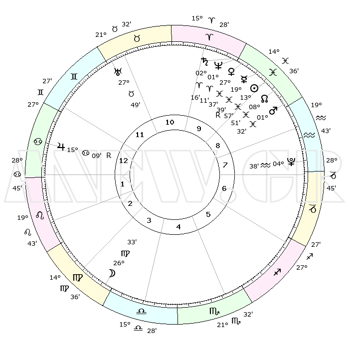 | | ΘΕΣΕΙΣ ΠΛΑΝΗΤΩΝ ΑΣΤΡΟΛΟΓΙΚΟΥ ΧΑΡΤΗ ΤΗΣ ΣΤΙΓΜΗΣ ΑΥΤΗΣ | | | | Πλανήτης | Ζώδιο | Μοίρες | Δεκαήμ. | Σε οίκο | Απόκλιση | | Ακμές των οίκων | | Ηλιος | Ιχθείς | 13°53' | Δεύτερο | 9 | 06 S 20 | | 1ος | 09°30' | Καρκίνος | | Σελήνη | Παρθένος | 25°43' | Τρίτο | 4 | 00 N 18 | | 2ος | 29°57' | Καρκίνος | | Ερμής | Ιχθείς | 19°42'R | Δεύτερο | 9 | 00 S 42 | | 3ος | 22°31' | Λέων | | Αφροδίτη | Ιχθείς | 27°32' | Τρίτο | 10 | 02 S 10 | | 4ος | 20°24' | Παρθένος | | Αρης | Ιχθείς | 01°29' | Πρώτο | 9 | 11 S 58 | | 5ος | 25°38' | Ζυγός | | Δίας | Καρκίνος | 15°09'R | Δεύτερο | 1 | 22 N 55 | | 6ος | 04°38' | Τοξότης | | Κρόνος | Κριός | 02°15' | Πρώτο | 10 | 01 S 03 | | 7ος | 09°30' | Αιγόκερως | | Ουρανός | Ταύρος | 27°49' | Τρίτο | 11 | 19 N 30 | | 8ος | 29°57' | Αιγόκερως | | Ποσειδώνας | Κριός | 01°10' | Πρώτο | 10 | 00 S 44 | | 9ος | 22°31' | Υδροχόος | | Πλούτωνας | Υδροχόος | 04°38' | Πρώτο | 8 | 22 S 52 | | 10ος | 20°24' | Ιχθείς | | Β. Δεσμός | Ιχθείς | 08°52' | Πρώτο | 9 | 08 S 15 | | 11ος | 25°38' | Κριός | | Ωροσκόπος | Καρκίνος | 09°30' | Πρώτο | | | 12ος | 04°38' | Δίδυμοι | | Μεσουράνημα | Ιχθείς | 20°24' | Τρίτο | | | |