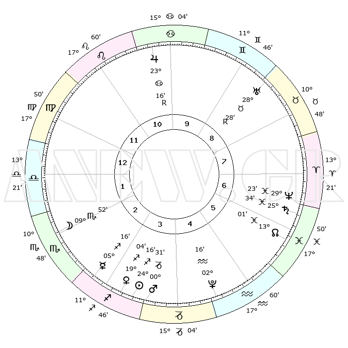 | | ΘΕΣΕΙΣ ΠΛΑΝΗΤΩΝ ΑΣΤΡΟΛΟΓΙΚΟΥ ΧΑΡΤΗ ΤΗΣ ΣΤΙΓΜΗΣ ΑΥΤΗΣ | | | | Πλανήτης | Ζώδιο | Μοίρες | Δεκαήμ. | Σε οίκο | Απόκλιση | | Ακμές των οίκων | | Ηλιος | Τοξότης | 23°22' | Τρίτο | 2 | 23 S 16 | | 1ος | 17°44' | Σκορπιός | | Σελήνη | Ζυγός | 29°27' | Τρίτο | 12 | 14 S 41 | | 2ος | 17°27' | Τοξότης | | Ερμής | Τοξότης | 04°05' | Πρώτο | 1 | 19 S 28 | | 3ος | 21°18' | Αιγόκερως | | Αφροδίτη | Τοξότης | 17°58' | Δεύτερο | 2 | 22 S 44 | | 4ος | 26°45' | Υδροχόος | | Αρης | Τοξότης | 29°51' | Τρίτο | 2 | 24 S 12 | | 5ος | 28°60' | Ιχθείς | | Δίας | Καρκίνος | 23°21'R | Τρίτο | 9 | 21 N 36 | | 6ος | 25°42' | Κριός | | Κρόνος | Ιχθείς | 25°32' | Τρίτο | 4 | 03 S 54 | | 7ος | 17°44' | Ταύρος | | Ουρανός | Ταύρος | 28°30'R | Τρίτο | 7 | 19 N 37 | | 8ος | 17°27' | Δίδυμοι | | Ποσειδώνας | Ιχθείς | 29°23' | Τρίτο | 5 | 01 S 29 | | 9ος | 21°18' | Καρκίνος | | Πλούτωνας | Υδροχόος | 02°15' | Πρώτο | 3 | 23 S 19 | | 10ος | 26°45' | Λέων | | Β. Δεσμός | Ιχθείς | 13°04' | Δεύτερο | 4 | 06 S 39 | | 11ος | 28°60' | Παρθένος | | Ωροσκόπος | Σκορπιός | 17°44' | Δεύτερο | | | 12ος | 25°42' | Ζυγός | | Μεσουράνημα | Λέων | 26°45' | Τρίτο | | | |