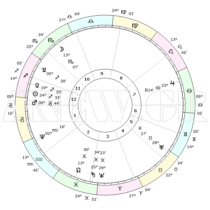 | | ΘΕΣΕΙΣ ΠΛΑΝΗΤΩΝ ΑΣΤΡΟΛΟΓΙΚΟΥ ΧΑΡΤΗ ΤΗΣ ΣΤΙΓΜΗΣ ΑΥΤΗΣ | | | | Πλανήτης | Ζώδιο | Μοίρες | Δεκαήμ. | Σε οίκο | Απόκλιση | | Ακμές των οίκων | | Ηλιος | Τοξότης | 24°14' | Τρίτο | 3 | 23 S 18 | | 1ος | 01°53' | Ζυγός | | Σελήνη | Σκορπιός | 09°25' | Πρώτο | 2 | 18 S 35 | | 2ος | 28°36' | Ζυγός | | Ερμής | Τοξότης | 05°13' | Πρώτο | 3 | 19 S 46 | | 3ος | 29°07' | Σκορπιός | | Αφροδίτη | Τοξότης | 19°01' | Δεύτερο | 3 | 22 S 51 | | 4ος | 02°07' | Αιγόκερως | | Αρης | Αιγόκερως | 00°30' | Πρώτο | 3 | 24 S 13 | | 5ος | 05°05' | Υδροχόος | | Δίας | Καρκίνος | 23°16'R | Τρίτο | 10 | 21 N 37 | | 6ος | 05°26' | Ιχθείς | | Κρόνος | Ιχθείς | 25°34' | Τρίτο | 6 | 03 S 53 | | 7ος | 01°53' | Κριός | | Ουρανός | Ταύρος | 28°28'R | Τρίτο | 8 | 19 N 37 | | 8ος | 28°36' | Κριός | | Ποσειδώνας | Ιχθείς | 29°23' | Τρίτο | 6 | 01 S 29 | | 9ος | 29°07' | Ταύρος | | Πλούτωνας | Υδροχόος | 02°16' | Πρώτο | 4 | 23 S 19 | | 10ος | 02°07' | Καρκίνος | | Β. Δεσμός | Ιχθείς | 13°01' | Δεύτερο | 6 | 06 S 40 | | 11ος | 05°05' | Λέων | | Ωροσκόπος | Ζυγός | 01°53' | Πρώτο | | | 12ος | 05°26' | Παρθένος | | Μεσουράνημα | Καρκίνος | 02°07' | Πρώτο | | | |