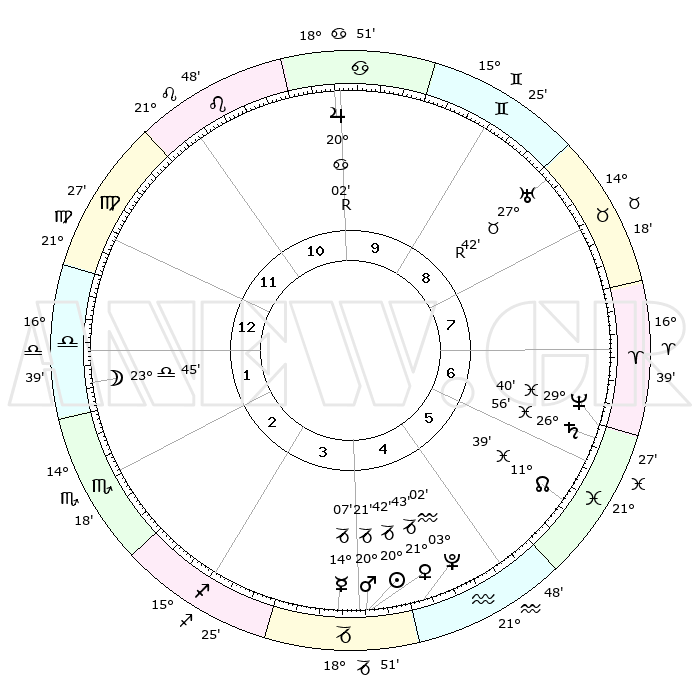 | | ΘΕΣΕΙΣ ΠΛΑΝΗΤΩΝ ΑΣΤΡΟΛΟΓΙΚΟΥ ΧΑΡΤΗ ΤΗΣ ΣΤΙΓΜΗΣ ΑΥΤΗΣ | | | | Πλανήτης | Ζώδιο | Μοίρες | Δεκαήμ. | Σε οίκο | Απόκλιση | | Ακμές των οίκων | | Ηλιος | Αιγόκερως | 20°01' | Τρίτο | 12 | 21 S 56 | | 1ος | 01°42' | Υδροχόος | | Σελήνη | Ζυγός | 15°40' | Δεύτερο | 8 | 08 S 54 | | 2ος | 16°04' | Ιχθείς | | Ερμής | Αιγόκερως | 13°04' | Δεύτερο | 12 | 24 S 15 | | 3ος | 24°14' | Κριός | | Αφροδίτη | Αιγόκερως | 20°53' | Τρίτο | 12 | 22 S 38 | | 4ος | 22°25' | Ταύρος | | Αρης | Αιγόκερως | 19°50' | Δεύτερο | 12 | 22 S 54 | | 5ος | 15°03' | Δίδυμοι | | Δίας | Καρκίνος | 20°07'R | Τρίτο | 6 | 22 N 11 | | 6ος | 06°32' | Καρκίνος | | Κρόνος | Ιχθείς | 26°53' | Τρίτο | 2 | 03 S 17 | | 7ος | 01°42' | Λέων | | Ουρανός | Ταύρος | 27°43'R | Τρίτο | 4 | 19 N 27 | | 8ος | 16°04' | Παρθένος | | Ποσειδώνας | Ιχθείς | 29°39' | Τρίτο | 2 | 01 S 21 | | 9ος | 24°14' | Ζυγός | | Πλούτωνας | Υδροχόος | 03°00' | Πρώτο | 1 | 23 S 10 | | 10ος | 22°25' | Σκορπιός | | Β. Δεσμός | Ιχθείς | 11°41' | Δεύτερο | 1 | 07 S 11 | | 11ος | 15°03' | Τοξότης | | Ωροσκόπος | Υδροχόος | 01°42' | Πρώτο | | | 12ος | 06°32' | Αιγόκερως | | Μεσουράνημα | Σκορπιός | 22°25' | Τρίτο | | | |