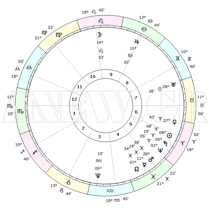 | | ΘΕΣΕΙΣ ΠΛΑΝΗΤΩΝ ΑΣΤΡΟΛΟΓΙΚΟΥ ΧΑΡΤΗ ΤΗΣ ΣΤΙΓΜΗΣ ΑΥΤΗΣ | | | | Πλανήτης | Ζώδιο | Μοίρες | Δεκαήμ. | Σε οίκο | Απόκλιση | | Ακμές των οίκων | | Ηλιος | Κριός | 08°04' | Πρώτο | 6 | 03 N 12 | | 1ος | 23°07' | Ζυγός | | Σελήνη | Λέων | 15°42' | Δεύτερο | 10 | 18 N 05 | | 2ος | 21°08' | Σκορπιός | | Ερμής | Ιχθείς | 11°15' | Δεύτερο | 5 | 08 S 02 | | 3ος | 22°36' | Τοξότης | | Αφροδίτη | Κριός | 27°39' | Τρίτο | 7 | 10 N 06 | | 4ος | 26°22' | Αιγόκερως | | Αρης | Ιχθείς | 20°35' | Τρίτο | 5 | 04 S 42 | | 5ος | 29°19' | Υδροχόος | | Δίας | Καρκίνος | 15°35' | Δεύτερο | 9 | 22 N 53 | | 6ος | 28°33' | Ιχθείς | | Κρόνος | Κριός | 05°15' | Πρώτο | 6 | 00 N 08 | | 7ος | 23°07' | Κριός | | Ουρανός | Ταύρος | 28°38' | Τρίτο | 8 | 19 N 41 | | 8ος | 21°08' | Ταύρος | | Ποσειδώνας | Κριός | 02°05' | Πρώτο | 6 | 00 S 22 | | 9ος | 22°36' | Δίδυμοι | | Πλούτωνας | Υδροχόος | 05°10' | Πρώτο | 4 | 22 S 48 | | 10ος | 26°22' | Καρκίνος | | Β. Δεσμός | Ιχθείς | 07°35' | Πρώτο | 5 | 08 S 44 | | 11ος | 29°19' | Λέων | | Ωροσκόπος | Ζυγός | 23°07' | Τρίτο | | | 12ος | 28°33' | Παρθένος | | Μεσουράνημα | Καρκίνος | 26°22' | Τρίτο | | | |