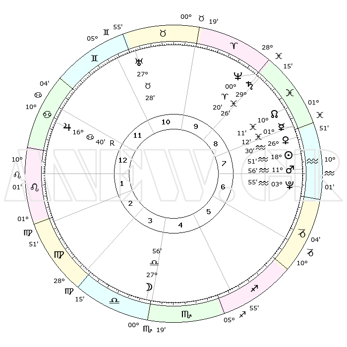 | | ΘΕΣΕΙΣ ΠΛΑΝΗΤΩΝ ΑΣΤΡΟΛΟΓΙΚΟΥ ΧΑΡΤΗ ΤΗΣ ΣΤΙΓΜΗΣ ΑΥΤΗΣ | | | | Πλανήτης | Ζώδιο | Μοίρες | Δεκαήμ. | Σε οίκο | Απόκλιση | | Ακμές των οίκων | | Ηλιος | Υδροχόος | 18°47' | Δεύτερο | 8 | 15 S 11 | | 1ος | 20°41' | Καρκίνος | | Σελήνη | Ζυγός | 27°08' | Τρίτο | 4 | 14 S 05 | | 2ος | 11°15' | Λέων | | Ερμής | Ιχθείς | 01°05' | Πρώτο | 8 | 12 S 16 | | 3ος | 05°04' | Παρθένος | | Αφροδίτη | Υδροχόος | 26°25' | Τρίτο | 8 | 14 S 03 | | 4ος | 04°47' | Ζυγός | | Αρης | Υδροχόος | 11°53' | Δεύτερο | 8 | 18 S 15 | | 5ος | 10°48' | Σκορπιός | | Δίας | Καρκίνος | 16°40'R | Δεύτερο | 12 | 22 N 42 | | 6ος | 18°05' | Τοξότης | | Κρόνος | Ιχθείς | 29°25' | Τρίτο | 9 | 02 S 13 | | 7ος | 20°41' | Αιγόκερως | | Ουρανός | Ταύρος | 27°28' | Τρίτο | 11 | 19 N 24 | | 8ος | 11°15' | Υδροχόος | | Ποσειδώνας | Κριός | 00°20' | Πρώτο | 9 | 01 S 04 | | 9ος | 05°04' | Ιχθείς | | Πλούτωνας | Υδροχόος | 03°54' | Πρώτο | 7 | 22 S 59 | | 10ος | 04°47' | Κριός | | Β. Δεσμός | Ιχθείς | 10°11' | Δεύτερο | 9 | 07 S 45 | | 11ος | 10°48' | Ταύρος | | Ωροσκόπος | Καρκίνος | 20°41' | Τρίτο | | | 12ος | 18°05' | Δίδυμοι | | Μεσουράνημα | Κριός | 04°47' | Πρώτο | | | |