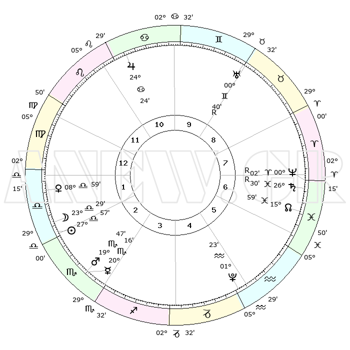 | ΘΕΣΕΙΣ ΠΛΑΝΗΤΩΝ ΑΣΤΡΟΛΟΓΙΚΟΥ ΧΑΡΤΗ ΤΗΣ ΣΤΙΓΜΗΣ ΑΥΤΗΣ | | Πλανήτης | Ζώδιο | Μοίρες | Δεκαήμ. | Σε οίκο | Απόκλιση | | Ακμές των οίκων | Ηλιος | Ζυγός | 27°47' | Τρίτο | 3 | 10 S 41 | | 1ος | 09°55' | Λέων | Σελήνη | Ζυγός | 21°20' | Τρίτο | 3 | 10 S 57 | | 2ος | 01°44' | Παρθένος | Ερμής | Σκορπιός | 20°02' | Τρίτο | 4 | 19 S 58 | | 3ος | 28°07' | Παρθένος | Αφροδίτη | Ζυγός | 08°46' | Πρώτο | 3 | 02 S 04 | | 4ος | 00°11' | Σκορπιός | Αρης | Σκορπιός | 19°39' | Δεύτερο | 4 | 17 S 55 | | 5ος | 05°48' | Τοξότης | Δίας | Καρκίνος | 24°23' | Τρίτο | 12 | 21 N 18 | | 6ος | 09°58' | Αιγόκερως | Κρόνος | Ιχθείς | 26°31'R | Τρίτο | 8 | 03 S 40 | | 7ος | 09°55' | Υδροχόος | Ουρανός | Δίδυμοι | 00°40'R | Πρώτο | 10 | 20 N 05 | | 8ος | 01°44' | Ιχθείς | Ποσειδώνας | Κριός | 00°02'R | Πρώτο | 9 | 01 S 15 | | 9ος | 28°07' | Ιχθείς | Πλούτωνας | Υδροχόος | 01°23' | Πρώτο | 6 | 23 S 32 | | 10ος | 00°11' | Ταύρος | Β. Δεσμός | Ιχθείς | 15°59' | Δεύτερο | 8 | 05 S 32 | | 11ος | 05°48' | Δίδυμοι | Ωροσκόπος | Λέων | 09°55' | Πρώτο | | | 12ος | 09°58' | Καρκίνος | Μεσουράνημα | Ταύρος | 00°11' | Πρώτο | | | |