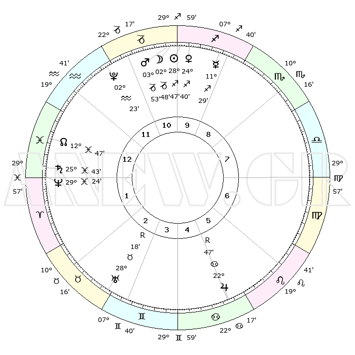 | | ΘΕΣΕΙΣ ΠΛΑΝΗΤΩΝ ΑΣΤΡΟΛΟΓΙΚΟΥ ΧΑΡΤΗ ΤΗΣ ΣΤΙΓΜΗΣ ΑΥΤΗΣ | | | | Πλανήτης | Ζώδιο | Μοίρες | Δεκαήμ. | Σε οίκο | Απόκλιση | | Ακμές των οίκων | | Ηλιος | Τοξότης | 28°43' | Τρίτο | 11 | 23 S 26 | | 1ος | 19°39' | Υδροχόος | | Σελήνη | Αιγόκερως | 01°56' | Πρώτο | 11 | 28 S 07 | | 2ος | 05°28' | Κριός | | Ερμής | Τοξότης | 11°23' | Δεύτερο | 10 | 21 S 18 | | 3ος | 10°15' | Ταύρος | | Αφροδίτη | Τοξότης | 24°34' | Τρίτο | 10 | 23 S 22 | | 4ος | 05°48' | Δίδυμοι | | Αρης | Αιγόκερως | 03°50' | Πρώτο | 11 | 24 S 11 | | 5ος | 27°38' | Δίδυμοι | | Δίας | Καρκίνος | 22°47'R | Τρίτο | 6 | 21 N 43 | | 6ος | 20°14' | Καρκίνος | | Κρόνος | Ιχθείς | 25°43' | Τρίτο | 1 | 03 S 49 | | 7ος | 19°39' | Λέων | | Ουρανός | Ταύρος | 28°18'R | Τρίτο | 3 | 19 N 35 | | 8ος | 05°28' | Ζυγός | | Ποσειδώνας | Ιχθείς | 29°24' | Τρίτο | 1 | 01 S 28 | | 9ος | 10°15' | Σκορπιός | | Πλούτωνας | Υδροχόος | 02°23' | Πρώτο | 12 | 23 S 18 | | 10ος | 05°48' | Τοξότης | | Β. Δεσμός | Ιχθείς | 12°47' | Δεύτερο | 1 | 06 S 46 | | 11ος | 27°38' | Τοξότης | | Ωροσκόπος | Υδροχόος | 19°39' | Δεύτερο | | | 12ος | 20°14' | Αιγόκερως | | Μεσουράνημα | Τοξότης | 05°48' | Πρώτο | | | |