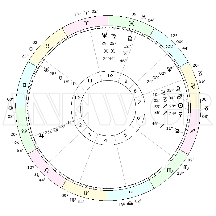 | | ΘΕΣΕΙΣ ΠΛΑΝΗΤΩΝ ΑΣΤΡΟΛΟΓΙΚΟΥ ΧΑΡΤΗ ΤΗΣ ΣΤΙΓΜΗΣ ΑΥΤΗΣ | | | | Πλανήτης | Ζώδιο | Μοίρες | Δεκαήμ. | Σε οίκο | Απόκλιση | | Ακμές των οίκων | | Ηλιος | Τοξότης | 28°51' | Τρίτο | 9 | 23 S 26 | | 1ος | 04°12' | Ταύρος | | Σελήνη | Αιγόκερως | 03°32' | Πρώτο | 9 | 28 S 02 | | 2ος | 05°16' | Δίδυμοι | | Ερμής | Τοξότης | 11°34' | Δεύτερο | 8 | 21 S 20 | | 3ος | 28°25' | Δίδυμοι | | Αφροδίτη | Τοξότης | 24°44' | Τρίτο | 8 | 23 S 23 | | 4ος | 20°08' | Καρκίνος | | Αρης | Αιγόκερως | 03°56' | Πρώτο | 9 | 24 S 11 | | 5ος | 14°58' | Λέων | | Δίας | Καρκίνος | 22°46'R | Τρίτο | 4 | 21 N 43 | | 6ος | 18°31' | Παρθένος | | Κρόνος | Ιχθείς | 25°43' | Τρίτο | 12 | 03 S 49 | | 7ος | 04°12' | Σκορπιός | | Ουρανός | Ταύρος | 28°18'R | Τρίτο | 1 | 19 N 35 | | 8ος | 05°16' | Τοξότης | | Ποσειδώνας | Ιχθείς | 29°24' | Τρίτο | 12 | 01 S 28 | | 9ος | 28°25' | Τοξότης | | Πλούτωνας | Υδροχόος | 02°23' | Πρώτο | 10 | 23 S 17 | | 10ος | 20°08' | Αιγόκερως | | Β. Δεσμός | Ιχθείς | 12°47' | Δεύτερο | 11 | 06 S 46 | | 11ος | 14°58' | Υδροχόος | | Ωροσκόπος | Ταύρος | 04°12' | Πρώτο | | | 12ος | 18°31' | Ιχθείς | | Μεσουράνημα | Αιγόκερως | 20°08' | Τρίτο | | | |