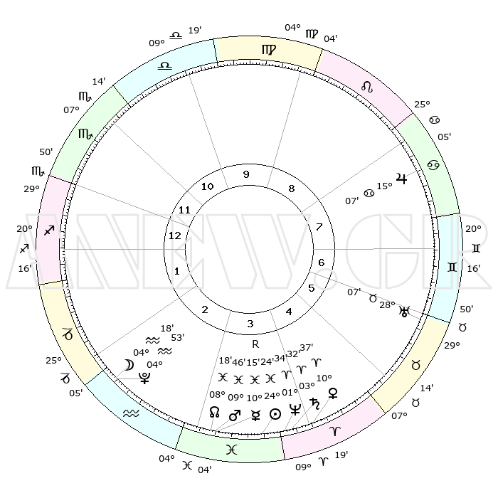 | | ΘΕΣΕΙΣ ΠΛΑΝΗΤΩΝ ΑΣΤΡΟΛΟΓΙΚΟΥ ΧΑΡΤΗ ΤΗΣ ΣΤΙΓΜΗΣ ΑΥΤΗΣ | | | | Πλανήτης | Ζώδιο | Μοίρες | Δεκαήμ. | Σε οίκο | Απόκλιση | | Ακμές των οίκων | | Ηλιος | Ιχθείς | 24°20' | Τρίτο | 4 | 02 S 15 | | 1ος | 00°13' | Τοξότης | | Σελήνη | Υδροχόος | 03°28' | Πρώτο | 2 | 22 S 21 | | 2ος | 01°23' | Αιγόκερως | | Ερμής | Ιχθείς | 10°18'R | Δεύτερο | 3 | 05 S 27 | | 3ος | 07°07' | Υδροχόος | | Αφροδίτη | Κριός | 10°32' | Δεύτερο | 4 | 03 N 12 | | 4ος | 13°10' | Ιχθείς | | Αρης | Ιχθείς | 09°43' | Πρώτο | 3 | 08 S 56 | | 5ος | 14°11' | Κριός | | Δίας | Καρκίνος | 15°07' | Δεύτερο | 8 | 22 N 56 | | 6ος | 09°12' | Ταύρος | | Κρόνος | Κριός | 03°32' | Πρώτο | 4 | 00 S 33 | | 7ος | 00°13' | Δίδυμοι | | Ουρανός | Ταύρος | 28°07' | Τρίτο | 6 | 19 N 34 | | 8ος | 01°23' | Καρκίνος | | Ποσειδώνας | Κριός | 01°34' | Πρώτο | 4 | 00 S 35 | | 9ος | 07°07' | Λέων | | Πλούτωνας | Υδροχόος | 04°53' | Πρώτο | 2 | 22 S 49 | | 10ος | 13°10' | Παρθένος | | Β. Δεσμός | Ιχθείς | 08°18' | Πρώτο | 3 | 08 S 27 | | 11ος | 14°11' | Ζυγός | | Ωροσκόπος | Τοξότης | 00°13' | Πρώτο | | | 12ος | 09°12' | Σκορπιός | | Μεσουράνημα | Παρθένος | 13°10' | Δεύτερο | | | |