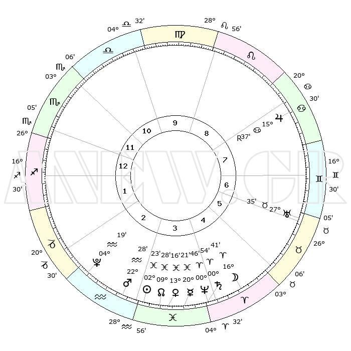 | | ΘΕΣΕΙΣ ΠΛΑΝΗΤΩΝ ΑΣΤΡΟΛΟΓΙΚΟΥ ΧΑΡΤΗ ΤΗΣ ΣΤΙΓΜΗΣ ΑΥΤΗΣ | | | | Πλανήτης | Ζώδιο | Μοίρες | Δεκαήμ. | Σε οίκο | Απόκλιση | | Ακμές των οίκων | | Ηλιος | Ιχθείς | 02°20' | Πρώτο | 3 | 10 S 39 | | 1ος | 28°17' | Σκορπιός | | Σελήνη | Κριός | 15°50' | Δεύτερο | 5 | 09 N 10 | | 2ος | 29°11' | Τοξότης | | Ερμής | Ιχθείς | 20°18' | Τρίτο | 4 | 02 S 28 | | 3ος | 04°37' | Υδροχόος | | Αφροδίτη | Ιχθείς | 13°12' | Δεύτερο | 4 | 07 S 56 | | 4ος | 10°37' | Ιχθείς | | Αρης | Υδροχόος | 22°25' | Τρίτο | 3 | 15 S 04 | | 5ος | 11°51' | Κριός | | Δίας | Καρκίνος | 15°37'R | Δεύτερο | 8 | 22 N 51 | | 6ος | 07°08' | Ταύρος | | Κρόνος | Κριός | 00°54' | Πρώτο | 4 | 01 S 36 | | 7ος | 28°17' | Ταύρος | | Ουρανός | Ταύρος | 27°35' | Τρίτο | 6 | 19 N 26 | | 8ος | 29°11' | Δίδυμοι | | Ποσειδώνας | Κριός | 00°46' | Πρώτο | 4 | 00 S 54 | | 9ος | 04°37' | Λέων | | Πλούτωνας | Υδροχόος | 04°19' | Πρώτο | 2 | 22 S 55 | | 10ος | 10°37' | Παρθένος | | Β. Δεσμός | Ιχθείς | 09°28' | Πρώτο | 3 | 08 S 01 | | 11ος | 11°51' | Ζυγός | | Ωροσκόπος | Σκορπιός | 28°17' | Τρίτο | | | 12ος | 07°08' | Σκορπιός | | Μεσουράνημα | Παρθένος | 10°37' | Δεύτερο | | | |