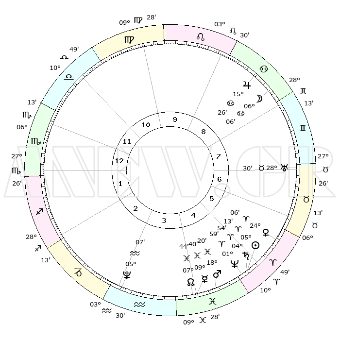 | | ΘΕΣΕΙΣ ΠΛΑΝΗΤΩΝ ΑΣΤΡΟΛΟΓΙΚΟΥ ΧΑΡΤΗ ΤΗΣ ΣΤΙΓΜΗΣ ΑΥΤΗΣ | | | | Πλανήτης | Ζώδιο | Μοίρες | Δεκαήμ. | Σε οίκο | Απόκλιση | | Ακμές των οίκων | | Ηλιος | Κριός | 05°10' | Πρώτο | 5 | 02 N 03 | | 1ος | 08°55' | Σκορπιός | | Σελήνη | Καρκίνος | 05°12' | Πρώτο | 8 | 28 N 01 | | 2ος | 07°54' | Τοξότης | | Ερμής | Ιχθείς | 09°38' | Πρώτο | 4 | 08 S 06 | | 3ος | 10°41' | Αιγόκερως | | Αφροδίτη | Κριός | 24°01' | Τρίτο | 6 | 08 N 41 | | 4ος | 15°31' | Υδροχόος | | Αρης | Ιχθείς | 18°17' | Δεύτερο | 5 | 05 S 37 | | 5ος | 18°14' | Ιχθείς | | Δίας | Καρκίνος | 15°26' | Δεύτερο | 9 | 22 N 54 | | 6ος | 15°60' | Κριός | | Κρόνος | Κριός | 04°53' | Πρώτο | 5 | 00 S 01 | | 7ος | 08°55' | Ταύρος | | Ουρανός | Ταύρος | 28°30' | Τρίτο | 7 | 19 N 39 | | 8ος | 07°54' | Δίδυμοι | | Ποσειδώνας | Κριός | 01°59' | Πρώτο | 5 | 00 S 25 | | 9ος | 10°41' | Καρκίνος | | Πλούτωνας | Υδροχόος | 05°07' | Πρώτο | 3 | 22 S 48 | | 10ος | 15°31' | Λέων | | Β. Δεσμός | Ιχθείς | 07°44' | Πρώτο | 4 | 08 S 40 | | 11ος | 18°14' | Παρθένος | | Ωροσκόπος | Σκορπιός | 08°55' | Πρώτο | | | 12ος | 15°60' | Ζυγός | | Μεσουράνημα | Λέων | 15°31' | Δεύτερο | | | |