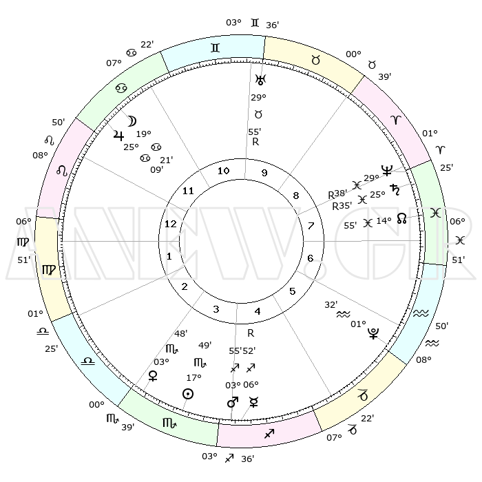 | | ΘΕΣΕΙΣ ΠΛΑΝΗΤΩΝ ΑΣΤΡΟΛΟΓΙΚΟΥ ΧΑΡΤΗ ΤΗΣ ΣΤΙΓΜΗΣ ΑΥΤΗΣ | | | | Πλανήτης | Ζώδιο | Μοίρες | Δεκαήμ. | Σε οίκο | Απόκλιση | | Ακμές των οίκων | | Ηλιος | Σκορπιός | 17°43' | Δεύτερο | 4 | 17 S 07 | | 1ος | 09°38' | Λέων | | Σελήνη | Καρκίνος | 18°01' | Δεύτερο | 12 | 26 N 30 | | 2ος | 01°26' | Παρθένος | | Ερμής | Τοξότης | 06°52' | Πρώτο | 5 | 23 S 45 | | 3ος | 27°47' | Παρθένος | | Αφροδίτη | Σκορπιός | 03°41' | Πρώτο | 4 | 11 S 30 | | 4ος | 29°49' | Ζυγός | | Αρης | Τοξότης | 03°51' | Πρώτο | 4 | 21 S 23 | | 5ος | 05°27' | Τοξότης | | Δίας | Καρκίνος | 25°09' | Τρίτο | 12 | 21 N 12 | | 6ος | 09°40' | Αιγόκερως | | Κρόνος | Ιχθείς | 25°35'R | Τρίτο | 8 | 04 S 00 | | 7ος | 09°38' | Υδροχόος | | Ουρανός | Ταύρος | 29°55'R | Τρίτο | 10 | 19 N 56 | | 8ος | 01°26' | Ιχθείς | | Ποσειδώνας | Ιχθείς | 29°38'R | Τρίτο | 9 | 01 S 24 | | 9ος | 27°47' | Ιχθείς | | Πλούτωνας | Υδροχόος | 01°32' | Πρώτο | 6 | 23 S 29 | | 10ος | 29°50' | Κριός | | Β. Δεσμός | Ιχθείς | 14°56' | Δεύτερο | 8 | 05 S 56 | | 11ος | 05°27' | Δίδυμοι | | Ωροσκόπος | Λέων | 09°38' | Πρώτο | | | 12ος | 09°40' | Καρκίνος | | Μεσουράνημα | Κριός | 29°50' | Τρίτο | | | |