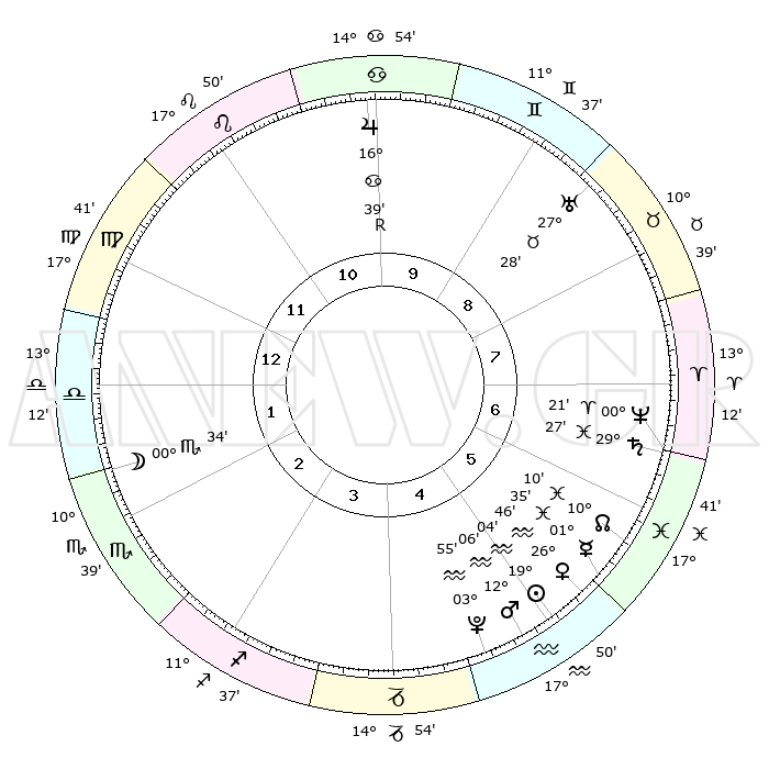 | | ΘΕΣΕΙΣ ΠΛΑΝΗΤΩΝ ΑΣΤΡΟΛΟΓΙΚΟΥ ΧΑΡΤΗ ΤΗΣ ΣΤΙΓΜΗΣ ΑΥΤΗΣ | | | | Πλανήτης | Ζώδιο | Μοίρες | Δεκαήμ. | Σε οίκο | Απόκλιση | | Ακμές των οίκων | | Ηλιος | Υδροχόος | 19°00' | Δεύτερο | 5 | 15 S 07 | | 1ος | 24°47' | Παρθένος | | Σελήνη | Ζυγός | 29°48' | Τρίτο | 2 | 15 S 12 | | 2ος | 20°58' | Ζυγός | | Ερμής | Ιχθείς | 01°28' | Πρώτο | 6 | 12 S 06 | | 3ος | 21°12' | Σκορπιός | | Αφροδίτη | Υδροχόος | 26°42' | Τρίτο | 5 | 13 S 58 | | 4ος | 24°08' | Τοξότης | | Αρης | Υδροχόος | 12°03' | Δεύτερο | 5 | 18 S 12 | | 5ος | 27°12' | Αιγόκερως | | Δίας | Καρκίνος | 16°39'R | Δεύτερο | 10 | 22 N 43 | | 6ος | 27°50' | Υδροχόος | | Κρόνος | Ιχθείς | 29°27' | Τρίτο | 7 | 02 S 12 | | 7ος | 24°47' | Ιχθείς | | Ουρανός | Ταύρος | 27°28' | Τρίτο | 9 | 19 N 24 | | 8ος | 20°58' | Κριός | | Ποσειδώνας | Κριός | 00°20' | Πρώτο | 7 | 01 S 04 | | 9ος | 21°12' | Ταύρος | | Πλούτωνας | Υδροχόος | 03°55' | Πρώτο | 5 | 22 S 59 | | 10ος | 24°08' | Δίδυμοι | | Β. Δεσμός | Ιχθείς | 10°10' | Δεύτερο | 6 | 07 S 45 | | 11ος | 27°12' | Καρκίνος | | Ωροσκόπος | Παρθένος | 24°47' | Τρίτο | | | 12ος | 27°50' | Λέων | | Μεσουράνημα | Δίδυμοι | 24°08' | Τρίτο | | | |