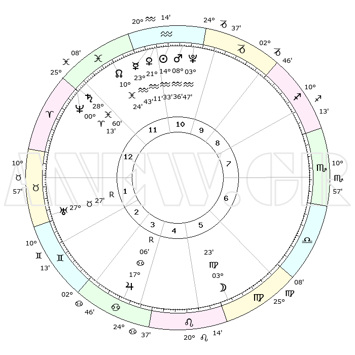 | | ΘΕΣΕΙΣ ΠΛΑΝΗΤΩΝ ΑΣΤΡΟΛΟΓΙΚΟΥ ΧΑΡΤΗ ΤΗΣ ΣΤΙΓΜΗΣ ΑΥΤΗΣ | | | | Πλανήτης | Ζώδιο | Μοίρες | Δεκαήμ. | Σε οίκο | Απόκλιση | | Ακμές των οίκων | | Ηλιος | Υδροχόος | 14°30' | Δεύτερο | 11 | 16 S 29 | | 1ος | 10°33' | Κριός | | Σελήνη | Παρθένος | 02°37' | Πρώτο | 6 | 11 N 05 | | 2ος | 18°08' | Ταύρος | | Ερμής | Υδροχόος | 23°37' | Τρίτο | 11 | 15 S 16 | | 3ος | 14°01' | Δίδυμοι | | Αφροδίτη | Υδροχόος | 21°07' | Τρίτο | 11 | 15 S 47 | | 4ος | 05°57' | Καρκίνος | | Αρης | Υδροχόος | 08°34' | Πρώτο | 11 | 19 S 08 | | 5ος | 28°48' | Καρκίνος | | Δίας | Καρκίνος | 17°06'R | Δεύτερο | 4 | 22 N 39 | | 6ος | 27°55' | Λέων | | Κρόνος | Ιχθείς | 28°59' | Τρίτο | 12 | 02 S 24 | | 7ος | 10°33' | Ζυγός | | Ουρανός | Ταύρος | 27°27'R | Τρίτο | 2 | 19 N 24 | | 8ος | 18°08' | Σκορπιός | | Ποσειδώνας | Κριός | 00°13' | Πρώτο | 12 | 01 S 07 | | 9ος | 14°01' | Τοξότης | | Πλούτωνας | Υδροχόος | 03°46' | Πρώτο | 11 | 23 S 00 | | 10ος | 05°57' | Αιγόκερως | | Β. Δεσμός | Ιχθείς | 10°24' | Δεύτερο | 12 | 07 S 40 | | 11ος | 28°48' | Αιγόκερως | | Ωροσκόπος | Κριός | 10°33' | Δεύτερο | | | 12ος | 27°55' | Υδροχόος | | Μεσουράνημα | Αιγόκερως | 05°57' | Πρώτο | | | |