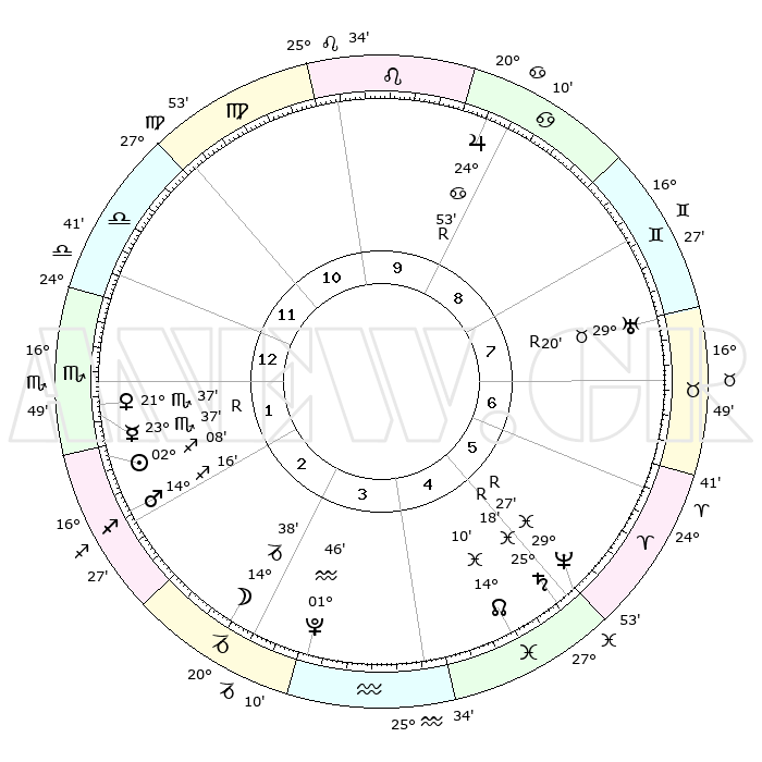 | | ΘΕΣΕΙΣ ΠΛΑΝΗΤΩΝ ΑΣΤΡΟΛΟΓΙΚΟΥ ΧΑΡΤΗ ΤΗΣ ΣΤΙΓΜΗΣ ΑΥΤΗΣ | | | | Πλανήτης | Ζώδιο | Μοίρες | Δεκαήμ. | Σε οίκο | Απόκλιση | | Ακμές των οίκων | | Ηλιος | Τοξότης | 02°07' | Πρώτο | 1 | 20 S 35 | | 1ος | 14°12' | Σκορπιός | | Σελήνη | Αιγόκερως | 14°32' | Δεύτερο | 2 | 26 S 58 | | 2ος | 13°37' | Τοξότης | | Ερμής | Σκορπιός | 23°38'R | Τρίτο | 1 | 17 S 03 | | 3ος | 16°60' | Αιγόκερως | | Αφροδίτη | Σκορπιός | 21°37' | Τρίτο | 1 | 17 S 15 | | 4ος | 22°13' | Υδροχόος | | Αρης | Τοξότης | 14°15' | Δεύτερο | 2 | 23 S 06 | | 5ος | 24°41' | Ιχθείς | | Δίας | Καρκίνος | 24°53'R | Τρίτο | 9 | 21 N 17 | | 6ος | 21°49' | Κριός | | Κρόνος | Ιχθείς | 25°18'R | Τρίτο | 5 | 04 S 04 | | 7ος | 14°12' | Ταύρος | | Ουρανός | Ταύρος | 29°20'R | Τρίτο | 7 | 19 N 48 | | 8ος | 13°37' | Δίδυμοι | | Ποσειδώνας | Ιχθείς | 29°27'R | Τρίτο | 5 | 01 S 28 | | 9ος | 16°60' | Καρκίνος | | Πλούτωνας | Υδροχόος | 01°46' | Πρώτο | 3 | 23 S 26 | | 10ος | 22°13' | Λέων | | Β. Δεσμός | Ιχθείς | 14°10' | Δεύτερο | 4 | 06 S 14 | | 11ος | 24°41' | Παρθένος | | Ωροσκόπος | Σκορπιός | 14°12' | Δεύτερο | | | 12ος | 21°49' | Ζυγός | | Μεσουράνημα | Λέων | 22°13' | Τρίτο | | | |