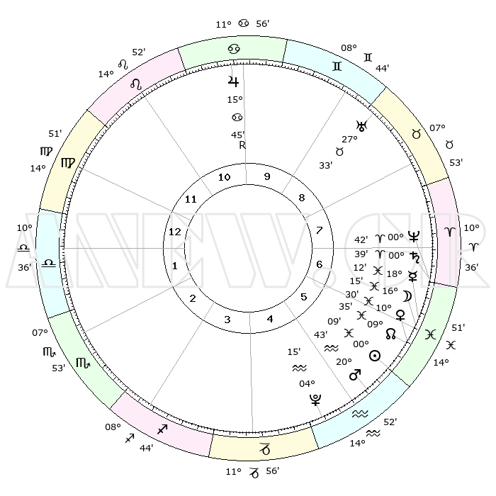 | | ΘΕΣΕΙΣ ΠΛΑΝΗΤΩΝ ΑΣΤΡΟΛΟΓΙΚΟΥ ΧΑΡΤΗ ΤΗΣ ΣΤΙΓΜΗΣ ΑΥΤΗΣ | | | | Πλανήτης | Ζώδιο | Μοίρες | Δεκαήμ. | Σε οίκο | Απόκλιση | | Ακμές των οίκων | | Ηλιος | Ιχθείς | 00°05' | Πρώτο | 6 | 11 S 26 | | 1ος | 19°06' | Παρθένος | | Σελήνη | Ιχθείς | 15°16' | Δεύτερο | 6 | 05 S 16 | | 2ος | 14°49' | Ζυγός | | Ερμής | Ιχθείς | 18°07' | Δεύτερο | 6 | 03 S 50 | | 3ος | 14°48' | Σκορπιός | | Αφροδίτη | Ιχθείς | 10°24' | Δεύτερο | 6 | 09 S 01 | | 4ος | 17°43' | Τοξότης | | Αρης | Υδροχόος | 20°40' | Τρίτο | 5 | 15 S 38 | | 5ος | 20°56' | Αιγόκερως | | Δίας | Καρκίνος | 15°46'R | Δεύτερο | 10 | 22 N 50 | | 6ος | 21°48' | Υδροχόος | | Κρόνος | Κριός | 00°39' | Πρώτο | 7 | 01 S 43 | | 7ος | 19°06' | Ιχθείς | | Ουρανός | Ταύρος | 27°33' | Τρίτο | 9 | 19 N 26 | | 8ος | 14°49' | Κριός | | Ποσειδώνας | Κριός | 00°41' | Πρώτο | 7 | 00 S 56 | | 9ος | 14°48' | Ταύρος | | Πλούτωνας | Υδροχόος | 04°15' | Πρώτο | 5 | 22 S 55 | | 10ος | 17°43' | Δίδυμοι | | Β. Δεσμός | Ιχθείς | 09°35' | Πρώτο | 6 | 07 S 58 | | 11ος | 20°56' | Καρκίνος | | Ωροσκόπος | Παρθένος | 19°06' | Δεύτερο | | | 12ος | 21°48' | Λέων | | Μεσουράνημα | Δίδυμοι | 17°43' | Δεύτερο | | | |