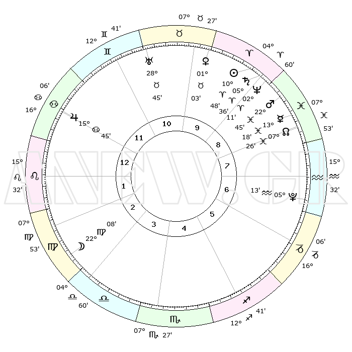 | | ΘΕΣΕΙΣ ΠΛΑΝΗΤΩΝ ΑΣΤΡΟΛΟΓΙΚΟΥ ΧΑΡΤΗ ΤΗΣ ΣΤΙΓΜΗΣ ΑΥΤΗΣ | | | | Πλανήτης | Ζώδιο | Μοίρες | Δεκαήμ. | Σε οίκο | Απόκλιση | | Ακμές των οίκων | | Ηλιος | Κριός | 10°44' | Δεύτερο | 9 | 04 N 15 | | 1ος | 28°23' | Καρκίνος | | Σελήνη | Παρθένος | 21°23' | Τρίτο | 3 | 02 N 22 | | 2ος | 19°19' | Λέων | | Ερμής | Ιχθείς | 13°15' | Δεύτερο | 8 | 07 S 42 | | 3ος | 14°09' | Παρθένος | | Αφροδίτη | Ταύρος | 00°58' | Πρώτο | 10 | 11 N 22 | | 4ος | 14°58' | Ζυγός | | Αρης | Ιχθείς | 22°42' | Τρίτο | 9 | 03 S 52 | | 5ος | 21°03' | Σκορπιός | | Δίας | Καρκίνος | 15°45' | Δεύτερο | 12 | 22 N 52 | | 6ος | 27°01' | Τοξότης | | Κρόνος | Κριός | 05°36' | Πρώτο | 9 | 00 N 16 | | 7ος | 28°23' | Αιγόκερως | | Ουρανός | Ταύρος | 28°44' | Τρίτο | 11 | 19 N 42 | | 8ος | 19°19' | Υδροχόος | | Ποσειδώνας | Κριός | 02°11' | Πρώτο | 9 | 00 S 20 | | 9ος | 14°09' | Ιχθείς | | Πλούτωνας | Υδροχόος | 05°12' | Πρώτο | 7 | 22 S 47 | | 10ος | 14°58' | Κριός | | Β. Δεσμός | Ιχθείς | 07°26' | Πρώτο | 8 | 08 S 47 | | 11ος | 21°03' | Ταύρος | | Ωροσκόπος | Καρκίνος | 28°23' | Τρίτο | | | 12ος | 27°01' | Δίδυμοι | | Μεσουράνημα | Κριός | 14°58' | Δεύτερο | | | |