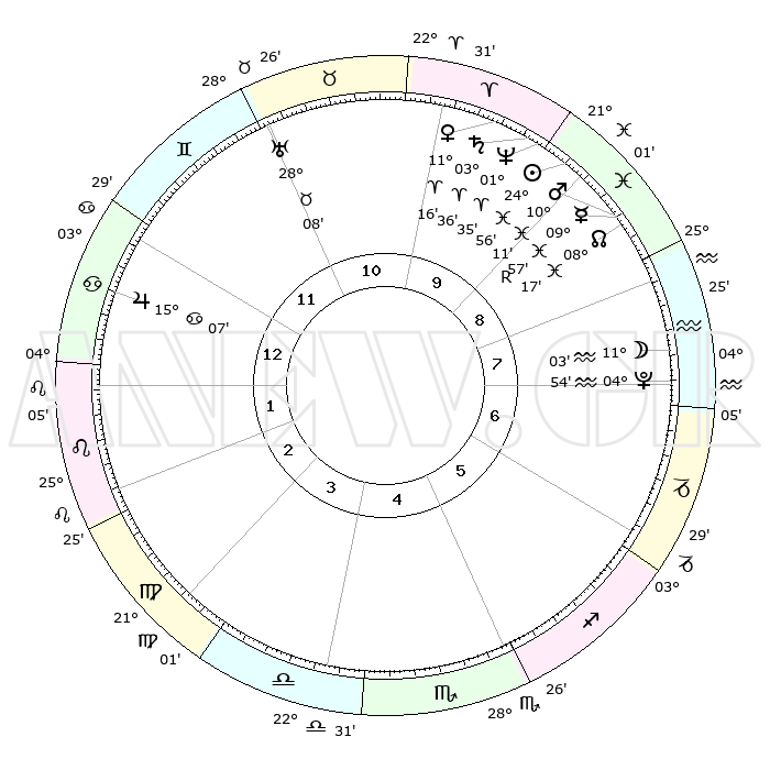 | | ΘΕΣΕΙΣ ΠΛΑΝΗΤΩΝ ΑΣΤΡΟΛΟΓΙΚΟΥ ΧΑΡΤΗ ΤΗΣ ΣΤΙΓΜΗΣ ΑΥΤΗΣ | | | | Πλανήτης | Ζώδιο | Μοίρες | Δεκαήμ. | Σε οίκο | Απόκλιση | | Ακμές των οίκων | | Ηλιος | Ιχθείς | 24°53' | Τρίτο | 9 | 02 S 02 | | 1ος | 18°43' | Καρκίνος | | Σελήνη | Υδροχόος | 10°23' | Δεύτερο | 8 | 20 S 04 | | 2ος | 09°13' | Λέων | | Ερμής | Ιχθείς | 09°58'R | Πρώτο | 9 | 05 S 41 | | 3ος | 02°48' | Παρθένος | | Αφροδίτη | Κριός | 11°12' | Δεύτερο | 10 | 03 N 29 | | 4ος | 02°13' | Ζυγός | | Αρης | Ιχθείς | 10°09' | Δεύτερο | 9 | 08 S 46 | | 5ος | 08°09' | Σκορπιός | | Δίας | Καρκίνος | 15°07' | Δεύτερο | 12 | 22 N 56 | | 6ος | 15°45' | Τοξότης | | Κρόνος | Κριός | 03°36' | Πρώτο | 10 | 00 S 31 | | 7ος | 18°43' | Αιγόκερως | | Ουρανός | Ταύρος | 28°08' | Τρίτο | 11 | 19 N 34 | | 8ος | 09°13' | Υδροχόος | | Ποσειδώνας | Κριός | 01°35' | Πρώτο | 9 | 00 S 34 | | 9ος | 02°48' | Ιχθείς | | Πλούτωνας | Υδροχόος | 04°54' | Πρώτο | 7 | 22 S 49 | | 10ος | 02°13' | Κριός | | Β. Δεσμός | Ιχθείς | 08°17' | Πρώτο | 9 | 08 S 28 | | 11ος | 08°09' | Ταύρος | | Ωροσκόπος | Καρκίνος | 18°43' | Δεύτερο | | | 12ος | 15°45' | Δίδυμοι | | Μεσουράνημα | Κριός | 02°13' | Πρώτο | | | |