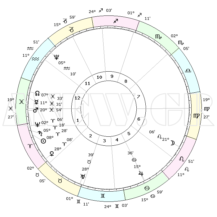 | | ΘΕΣΕΙΣ ΠΛΑΝΗΤΩΝ ΑΣΤΡΟΛΟΓΙΚΟΥ ΧΑΡΤΗ ΤΗΣ ΣΤΙΓΜΗΣ ΑΥΤΗΣ | | | | Πλανήτης | Ζώδιο | Μοίρες | Δεκαήμ. | Σε οίκο | Απόκλιση | | Ακμές των οίκων | | Ηλιος | Κριός | 08°24' | Πρώτο | 2 | 03 N 20 | | 1ος | 18°21' | Υδροχόος | | Σελήνη | Λέων | 20°21' | Τρίτο | 7 | 16 N 16 | | 2ος | 04°09' | Κριός | | Ερμής | Ιχθείς | 11°29' | Δεύτερο | 1 | 08 S 00 | | 3ος | 09°12' | Ταύρος | | Αφροδίτη | Κριός | 28°04' | Τρίτο | 2 | 10 N 16 | | 4ος | 04°55' | Δίδυμοι | | Αρης | Ιχθείς | 20°51' | Τρίτο | 1 | 04 S 36 | | 5ος | 26°46' | Δίδυμοι | | Δίας | Καρκίνος | 15°36' | Δεύτερο | 5 | 22 N 53 | | 6ος | 19°16' | Καρκίνος | | Κρόνος | Κριός | 05°18' | Πρώτο | 2 | 00 N 09 | | 7ος | 18°21' | Λέων | | Ουρανός | Ταύρος | 28°38' | Τρίτο | 3 | 19 N 41 | | 8ος | 04°09' | Ζυγός | | Ποσειδώνας | Κριός | 02°06' | Πρώτο | 1 | 00 S 22 | | 9ος | 09°12' | Σκορπιός | | Πλούτωνας | Υδροχόος | 05°10' | Πρώτο | 12 | 22 S 48 | | 10ος | 04°55' | Τοξότης | | Β. Δεσμός | Ιχθείς | 07°33' | Πρώτο | 1 | 08 S 44 | | 11ος | 26°46' | Τοξότης | | Ωροσκόπος | Υδροχόος | 18°21' | Δεύτερο | | | 12ος | 19°16' | Αιγόκερως | | Μεσουράνημα | Τοξότης | 04°55' | Πρώτο | | | |