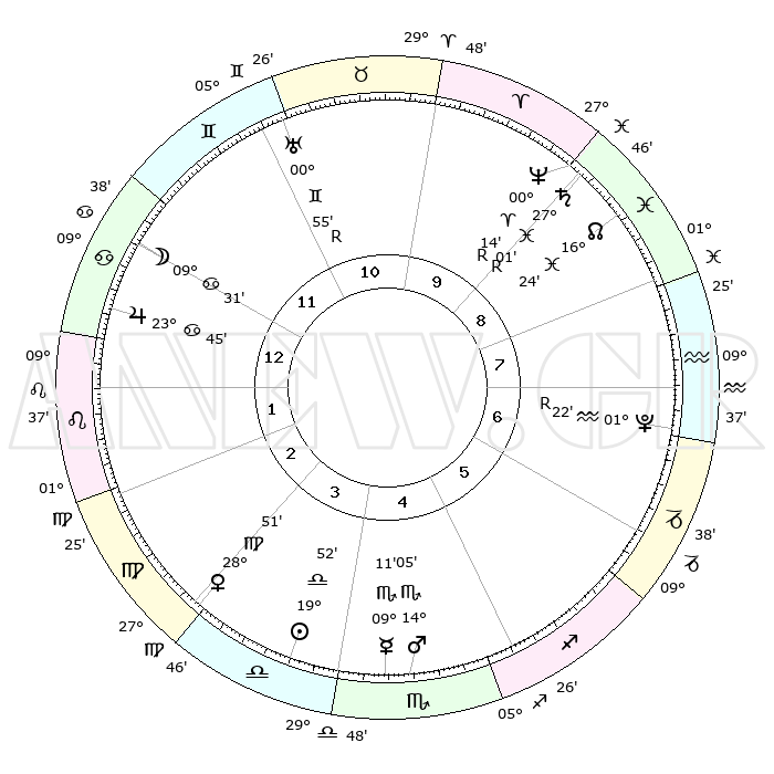 | ΘΕΣΕΙΣ ΠΛΑΝΗΤΩΝ ΑΣΤΡΟΛΟΓΙΚΟΥ ΧΑΡΤΗ ΤΗΣ ΣΤΙΓΜΗΣ ΑΥΤΗΣ | | Πλανήτης | Ζώδιο | Μοίρες | Δεκαήμ. | Σε οίκο | Απόκλιση | | Ακμές των οίκων | Ηλιος | Ζυγός | 19°47' | Δεύτερο | 4 | 07 S 44 | | 1ος | 13°32' | Καρκίνος | Σελήνη | Καρκίνος | 08°17' | Πρώτο | 12 | 28 N 03 | | 2ος | 03°58' | Λέων | Ερμής | Σκορπιός | 09°04' | Πρώτο | 5 | 15 S 56 | | 3ος | 26°57' | Λέων | Αφροδίτη | Παρθένος | 28°44' | Τρίτο | 4 | 01 N 52 | | 4ος | 25°31' | Παρθένος | Αρης | Σκορπιός | 14°01' | Δεύτερο | 5 | 16 S 14 | | 5ος | 01°07' | Σκορπιός | Δίας | Καρκίνος | 23°44' | Τρίτο | 1 | 21 N 23 | | 6ος | 09°33' | Τοξότης | Κρόνος | Ιχθείς | 27°02'R | Τρίτο | 10 | 03 S 29 | | 7ος | 13°32' | Αιγόκερως | Ουρανός | Δίδυμοι | 00°55'R | Πρώτο | 11 | 20 N 08 | | 8ος | 03°58' | Υδροχόος | Ποσειδώνας | Κριός | 00°14'R | Πρώτο | 10 | 01 S 10 | | 9ος | 26°57' | Υδροχόος | Πλούτωνας | Υδροχόος | 01°22'R | Πρώτο | 7 | 23 S 32 | | 10ος | 25°31' | Ιχθείς | Β. Δεσμός | Ιχθείς | 16°25' | Δεύτερο | 9 | 05 S 22 | | 11ος | 01°07' | Ταύρος | Ωροσκόπος | Καρκίνος | 13°32' | Δεύτερο | | | 12ος | 09°33' | Δίδυμοι | Μεσουράνημα | Ιχθείς | 25°31' | Τρίτο | | | |