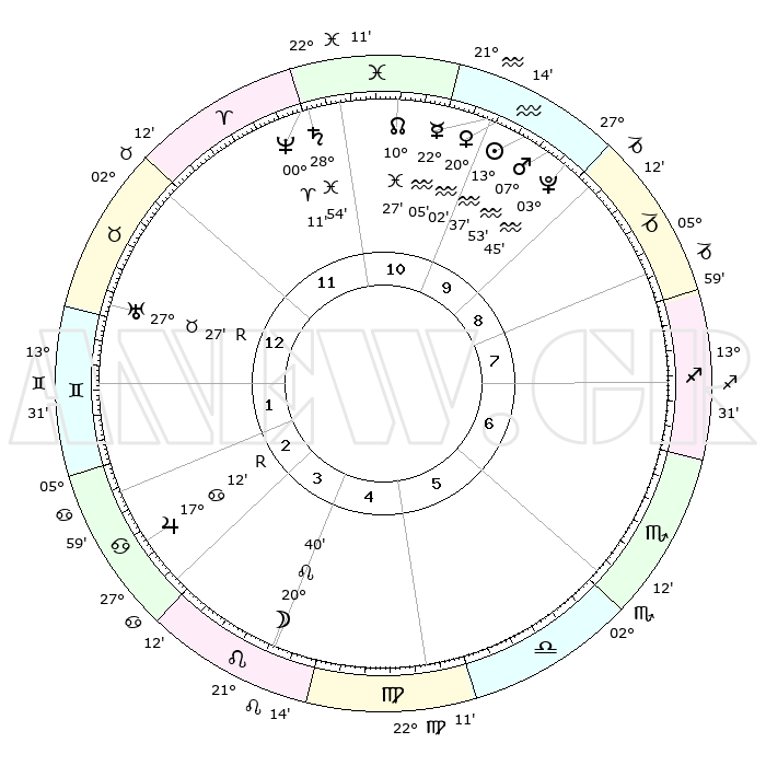 | | ΘΕΣΕΙΣ ΠΛΑΝΗΤΩΝ ΑΣΤΡΟΛΟΓΙΚΟΥ ΧΑΡΤΗ ΤΗΣ ΣΤΙΓΜΗΣ ΑΥΤΗΣ | | | | Πλανήτης | Ζώδιο | Μοίρες | Δεκαήμ. | Σε οίκο | Απόκλιση | | Ακμές των οίκων | | Ηλιος | Υδροχόος | 13°33' | Δεύτερο | 10 | 16 S 45 | | 1ος | 12°42' | Ταύρος | | Σελήνη | Λέων | 19°40' | Δεύτερο | 4 | 16 N 34 | | 2ος | 11°31' | Δίδυμοι | | Ερμής | Υδροχόος | 21°57' | Τρίτο | 11 | 15 S 53 | | 3ος | 03°55' | Καρκίνος | | Αφροδίτη | Υδροχόος | 19°56' | Δεύτερο | 10 | 16 S 08 | | 4ος | 25°49' | Καρκίνος | | Αρης | Υδροχόος | 07°50' | Πρώτο | 10 | 19 S 19 | | 5ος | 21°40' | Λέων | | Δίας | Καρκίνος | 17°12'R | Δεύτερο | 3 | 22 N 38 | | 6ος | 26°55' | Παρθένος | | Κρόνος | Ιχθείς | 28°54' | Τρίτο | 12 | 02 S 26 | | 7ος | 12°42' | Σκορπιός | | Ουρανός | Ταύρος | 27°27'R | Τρίτο | 1 | 19 N 24 | | 8ος | 11°31' | Τοξότης | | Ποσειδώνας | Κριός | 00°11' | Πρώτο | 12 | 01 S 08 | | 9ος | 03°56' | Αιγόκερως | | Πλούτωνας | Υδροχόος | 03°45' | Πρώτο | 10 | 23 S 01 | | 10ος | 25°49' | Αιγόκερως | | Β. Δεσμός | Ιχθείς | 10°27' | Δεύτερο | 11 | 07 S 39 | | 11ος | 21°40' | Υδροχόος | | Ωροσκόπος | Ταύρος | 12°42' | Δεύτερο | | | 12ος | 26°55' | Ιχθείς | | Μεσουράνημα | Αιγόκερως | 25°49' | Τρίτο | | | |