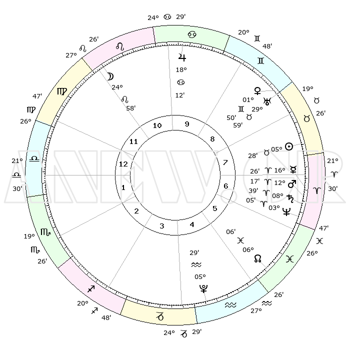| | ΘΕΣΕΙΣ ΠΛΑΝΗΤΩΝ ΑΣΤΡΟΛΟΓΙΚΟΥ ΧΑΡΤΗ ΤΗΣ ΣΤΙΓΜΗΣ ΑΥΤΗΣ | | | | Πλανήτης | Ζώδιο | Μοίρες | Δεκαήμ. | Σε οίκο | Απόκλιση | | Ακμές των οίκων | | Ηλιος | Ταύρος | 05°24' | Πρώτο | 8 | 13 N 19 | | 1ος | 03°20' | Ζυγός | | Σελήνη | Λέων | 24°09' | Τρίτο | 11 | 14 N 34 | | 2ος | 00°09' | Σκορπιός | | Ερμής | Κριός | 16°20' | Δεύτερο | 7 | 04 N 12 | | 3ος | 00°43' | Τοξότης | | Αφροδίτη | Δίδυμοι | 01°45' | Πρώτο | 9 | 21 N 09 | | 4ος | 03°45' | Αιγόκερως | | Αρης | Κριός | 12°14' | Δεύτερο | 7 | 03 N 59 | | 5ος | 06°42' | Υδροχόος | | Δίας | Καρκίνος | 18°12' | Δεύτερο | 10 | 22 N 35 | | 6ος | 06°60' | Ιχθείς | | Κρόνος | Κριός | 08°39' | Πρώτο | 7 | 01 N 26 | | 7ος | 03°20' | Κριός | | Ουρανός | Ταύρος | 29°59' | Τρίτο | 8 | 19 N 59 | | 8ος | 00°09' | Ταύρος | | Ποσειδώνας | Κριός | 03°05' | Πρώτο | 6 | 00 N 01 | | 9ος | 00°43' | Δίδυμοι | | Πλούτωνας | Υδροχόος | 05°29' | Πρώτο | 4 | 22 S 48 | | 10ος | 03°45' | Καρκίνος | | Β. Δεσμός | Ιχθείς | 06°06' | Πρώτο | 5 | 09 S 16 | | 11ος | 06°42' | Λέων | | Ωροσκόπος | Ζυγός | 03°20' | Πρώτο | | | 12ος | 06°60' | Παρθένος | | Μεσουράνημα | Καρκίνος | 03°45' | Πρώτο | | | |