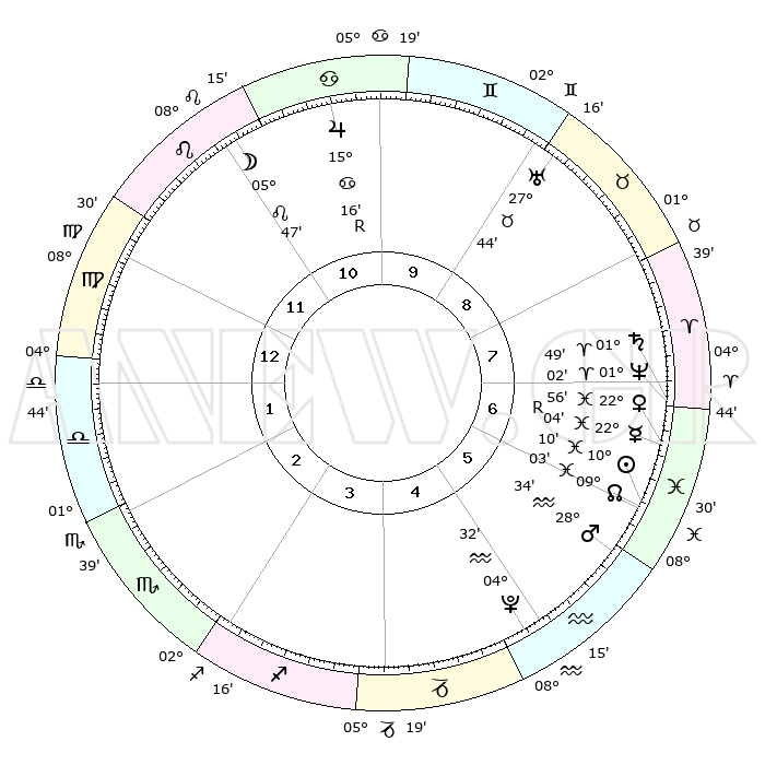 | | ΘΕΣΕΙΣ ΠΛΑΝΗΤΩΝ ΑΣΤΡΟΛΟΓΙΚΟΥ ΧΑΡΤΗ ΤΗΣ ΣΤΙΓΜΗΣ ΑΥΤΗΣ | | | | Πλανήτης | Ζώδιο | Μοίρες | Δεκαήμ. | Σε οίκο | Απόκλιση | | Ακμές των οίκων | | Ηλιος | Ιχθείς | 10°07' | Δεύτερο | 6 | 07 S 46 | | 1ος | 19°47' | Παρθένος | | Σελήνη | Λέων | 05°05' | Πρώτο | 11 | 21 N 51 | | 2ος | 15°34' | Ζυγός | | Ερμής | Ιχθείς | 22°06'R | Τρίτο | 7 | 00 S 09 | | 3ος | 15°34' | Σκορπιός | | Αφροδίτη | Ιχθείς | 22°52' | Τρίτο | 7 | 04 S 05 | | 4ος | 18°30' | Τοξότης | | Αρης | Υδροχόος | 28°31' | Τρίτο | 6 | 13 S 01 | | 5ος | 21°41' | Αιγόκερως | | Δίας | Καρκίνος | 15°16'R | Δεύτερο | 10 | 22 N 54 | | 6ος | 22°31' | Υδροχόος | | Κρόνος | Κριός | 01°48' | Πρώτο | 7 | 01 S 14 | | 7ος | 19°47' | Ιχθείς | | Ουρανός | Ταύρος | 27°44' | Τρίτο | 9 | 19 N 28 | | 8ος | 15°34' | Κριός | | Ποσειδώνας | Κριός | 01°02' | Πρώτο | 7 | 00 S 47 | | 9ος | 15°34' | Ταύρος | | Πλούτωνας | Υδροχόος | 04°32' | Πρώτο | 5 | 22 S 53 | | 10ος | 18°30' | Δίδυμοι | | Β. Δεσμός | Ιχθείς | 09°04' | Πρώτο | 6 | 08 S 10 | | 11ος | 21°41' | Καρκίνος | | Ωροσκόπος | Παρθένος | 19°47' | Δεύτερο | | | 12ος | 22°31' | Λέων | | Μεσουράνημα | Δίδυμοι | 18°30' | Δεύτερο | | | |