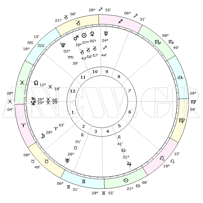 | | ΘΕΣΕΙΣ ΠΛΑΝΗΤΩΝ ΑΣΤΡΟΛΟΓΙΚΟΥ ΧΑΡΤΗ ΤΗΣ ΣΤΙΓΜΗΣ ΑΥΤΗΣ | | | | Πλανήτης | Ζώδιο | Μοίρες | Δεκαήμ. | Σε οίκο | Απόκλιση | | Ακμές των οίκων | | Ηλιος | Αιγόκερως | 07°52' | Πρώτο | 11 | 23 S 12 | | 1ος | 21°12' | Υδροχόος | | Σελήνη | Κριός | 27°47' | Τρίτο | 2 | 14 N 07 | | 2ος | 07°00' | Κριός | | Ερμής | Τοξότης | 24°38' | Τρίτο | 10 | 23 S 36 | | 3ος | 11°29' | Ταύρος | | Αφροδίτη | Αιγόκερως | 05°52' | Πρώτο | 11 | 23 S 42 | | 4ος | 06°50' | Δίδυμοι | | Αρης | Αιγόκερως | 10°40' | Δεύτερο | 11 | 23 S 53 | | 5ος | 28°38' | Δίδυμοι | | Δίας | Καρκίνος | 21°42'R | Τρίτο | 6 | 21 N 55 | | 6ος | 21°22' | Καρκίνος | | Κρόνος | Ιχθείς | 26°08' | Τρίτο | 1 | 03 S 37 | | 7ος | 21°12' | Λέων | | Ουρανός | Ταύρος | 28°01'R | Τρίτο | 3 | 19 N 31 | | 8ος | 07°00' | Ζυγός | | Ποσειδώνας | Ιχθείς | 29°29' | Τρίτο | 1 | 01 S 26 | | 9ος | 11°29' | Σκορπιός | | Πλούτωνας | Υδροχόος | 02°39' | Πρώτο | 12 | 23 S 14 | | 10ος | 06°50' | Τοξότης | | Β. Δεσμός | Ιχθείς | 12°19' | Δεύτερο | 1 | 06 S 56 | | 11ος | 28°38' | Τοξότης | | Ωροσκόπος | Υδροχόος | 21°12' | Τρίτο | | | 12ος | 21°22' | Αιγόκερως | | Μεσουράνημα | Τοξότης | 06°50' | Πρώτο | | | |