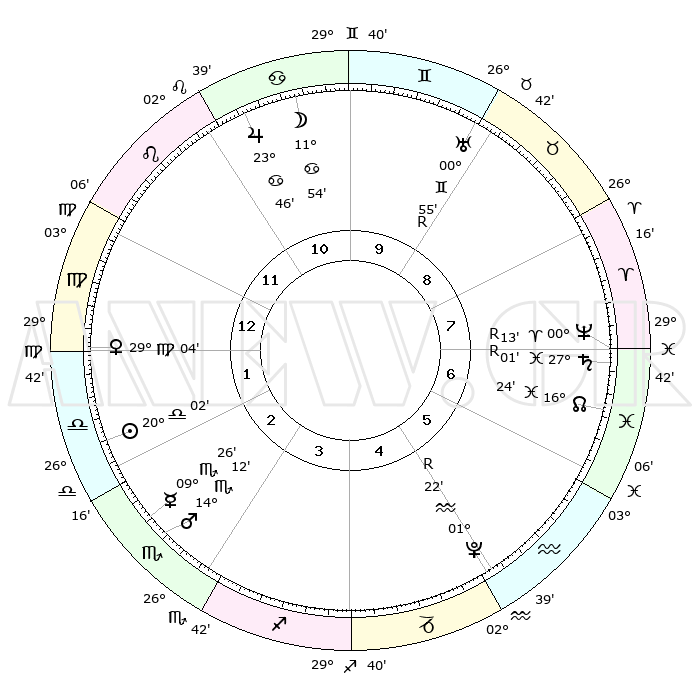 | ΘΕΣΕΙΣ ΠΛΑΝΗΤΩΝ ΑΣΤΡΟΛΟΓΙΚΟΥ ΧΑΡΤΗ ΤΗΣ ΣΤΙΓΜΗΣ ΑΥΤΗΣ | | Πλανήτης | Ζώδιο | Μοίρες | Δεκαήμ. | Σε οίκο | Απόκλιση | | Ακμές των οίκων | Ηλιος | Ζυγός | 19°56' | Δεύτερο | 2 | 07 S 48 | | 1ος | 29°57' | Λέων | Σελήνη | Καρκίνος | 10°30' | Δεύτερο | 11 | 27 N 49 | | 2ος | 23°48' | Παρθένος | Ερμής | Σκορπιός | 09°17' | Πρώτο | 3 | 16 S 01 | | 3ος | 22°28' | Ζυγός | Αφροδίτη | Παρθένος | 28°56' | Τρίτο | 2 | 01 N 48 | | 4ος | 25°23' | Σκορπιός | Αρης | Σκορπιός | 14°08' | Δεύτερο | 3 | 16 S 16 | | 5ος | 29°34' | Τοξότης | Δίας | Καρκίνος | 23°45' | Τρίτο | 11 | 21 N 23 | | 6ος | 01°32' | Υδροχόος | Κρόνος | Ιχθείς | 27°01'R | Τρίτο | 8 | 03 S 29 | | 7ος | 29°57' | Υδροχόος | Ουρανός | Δίδυμοι | 00°55'R | Πρώτο | 10 | 20 N 08 | | 8ος | 23°48' | Ιχθείς | Ποσειδώνας | Κριός | 00°14'R | Πρώτο | 8 | 01 S 10 | | 9ος | 22°28' | Κριός | Πλούτωνας | Υδροχόος | 01°22'R | Πρώτο | 5 | 23 S 32 | | 10ος | 25°23' | Ταύρος | Β. Δεσμός | Ιχθείς | 16°24' | Δεύτερο | 7 | 05 S 22 | | 11ος | 29°34' | Δίδυμοι | Ωροσκόπος | Λέων | 29°57' | Τρίτο | | | 12ος | 01°32' | Λέων | Μεσουράνημα | Ταύρος | 25°23' | Τρίτο | | | |