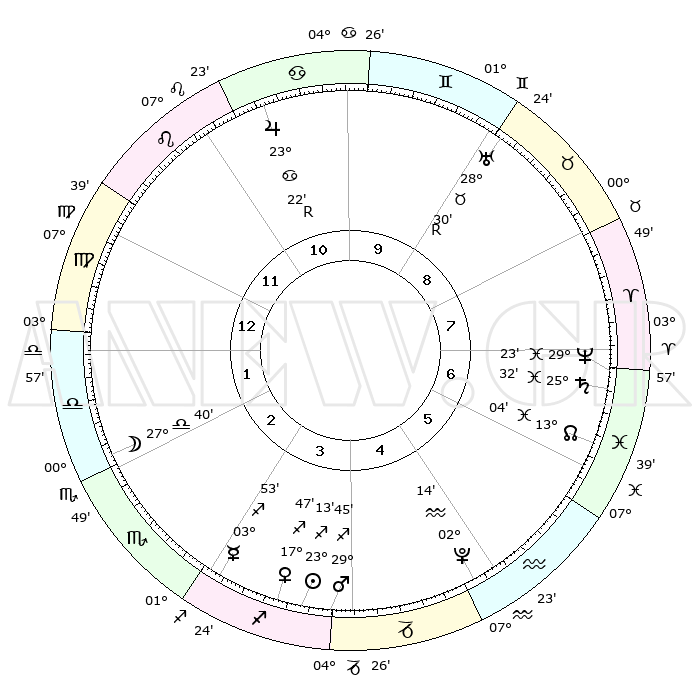 | | ΘΕΣΕΙΣ ΠΛΑΝΗΤΩΝ ΑΣΤΡΟΛΟΓΙΚΟΥ ΧΑΡΤΗ ΤΗΣ ΣΤΙΓΜΗΣ ΑΥΤΗΣ | | | | Πλανήτης | Ζώδιο | Μοίρες | Δεκαήμ. | Σε οίκο | Απόκλιση | | Ακμές των οίκων | | Ηλιος | Τοξότης | 22°52' | Τρίτο | 7 | 23 S 14 | | 1ος | 19°59' | Δίδυμοι | | Σελήνη | Ζυγός | 23°33' | Τρίτο | 5 | 12 S 11 | | 2ος | 11°38' | Καρκίνος | | Ερμής | Τοξότης | 03°26' | Πρώτο | 6 | 19 S 17 | | 3ος | 02°58' | Λέων | | Αφροδίτη | Τοξότης | 17°20' | Δεύτερο | 6 | 22 S 39 | | 4ος | 27°49' | Λέων | | Αρης | Τοξότης | 29°29' | Τρίτο | 7 | 24 S 12 | | 5ος | 29°59' | Παρθένος | | Δίας | Καρκίνος | 23°24'R | Τρίτο | 2 | 21 N 36 | | 6ος | 10°17' | Σκορπιός | | Κρόνος | Ιχθείς | 25°31' | Τρίτο | 10 | 03 S 55 | | 7ος | 19°59' | Τοξότης | | Ουρανός | Ταύρος | 28°31'R | Τρίτο | 12 | 19 N 38 | | 8ος | 11°38' | Αιγόκερως | | Ποσειδώνας | Ιχθείς | 29°23' | Τρίτο | 10 | 01 S 29 | | 9ος | 02°58' | Υδροχόος | | Πλούτωνας | Υδροχόος | 02°14' | Πρώτο | 8 | 23 S 20 | | 10ος | 27°49' | Υδροχόος | | Β. Δεσμός | Ιχθείς | 13°05' | Δεύτερο | 10 | 06 S 39 | | 11ος | 29°59' | Ιχθείς | | Ωροσκόπος | Δίδυμοι | 19°59' | Δεύτερο | | | 12ος | 10°17' | Ταύρος | | Μεσουράνημα | Υδροχόος | 27°49' | Τρίτο | | | |