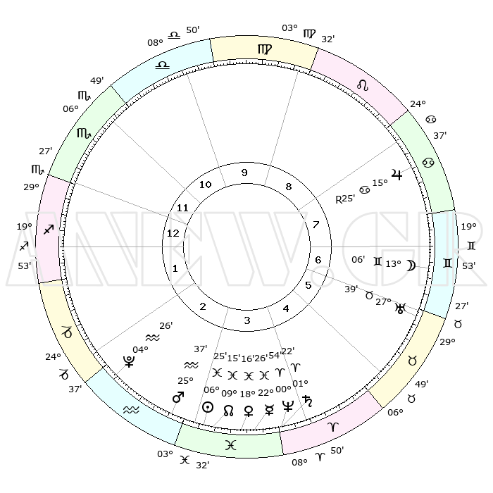 | | ΘΕΣΕΙΣ ΠΛΑΝΗΤΩΝ ΑΣΤΡΟΛΟΓΙΚΟΥ ΧΑΡΤΗ ΤΗΣ ΣΤΙΓΜΗΣ ΑΥΤΗΣ | | | | Πλανήτης | Ζώδιο | Μοίρες | Δεκαήμ. | Σε οίκο | Απόκλιση | | Ακμές των οίκων | | Ηλιος | Ιχθείς | 06°22' | Πρώτο | 3 | 09 S 10 | | 1ος | 04°08' | Τοξότης | | Σελήνη | Δίδυμοι | 12°22' | Δεύτερο | 7 | 27 N 30 | | 2ος | 05°53' | Αιγόκερως | | Ερμής | Ιχθείς | 22°25' | Τρίτο | 4 | 00 S 43 | | 3ος | 12°17' | Υδροχόος | | Αφροδίτη | Ιχθείς | 18°12' | Δεύτερο | 3 | 05 S 58 | | 4ος | 18°22' | Ιχθείς | | Αρης | Υδροχόος | 25°35' | Τρίτο | 3 | 14 S 01 | | 5ος | 18°51' | Κριός | | Δίας | Καρκίνος | 15°25'R | Δεύτερο | 8 | 22 N 53 | | 6ος | 13°21' | Ταύρος | | Κρόνος | Κριός | 01°22' | Πρώτο | 4 | 01 S 25 | | 7ος | 04°08' | Δίδυμοι | | Ουρανός | Ταύρος | 27°39' | Τρίτο | 6 | 19 N 27 | | 8ος | 05°53' | Καρκίνος | | Ποσειδώνας | Κριός | 00°54' | Πρώτο | 4 | 00 S 50 | | 9ος | 12°17' | Λέων | | Πλούτωνας | Υδροχόος | 04°26' | Πρώτο | 2 | 22 S 54 | | 10ος | 18°22' | Παρθένος | | Β. Δεσμός | Ιχθείς | 09°15' | Πρώτο | 3 | 08 S 06 | | 11ος | 18°51' | Ζυγός | | Ωροσκόπος | Τοξότης | 04°08' | Πρώτο | | | 12ος | 13°21' | Σκορπιός | | Μεσουράνημα | Παρθένος | 18°22' | Δεύτερο | | | |