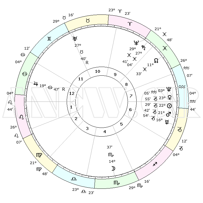 | | ΘΕΣΕΙΣ ΠΛΑΝΗΤΩΝ ΑΣΤΡΟΛΟΓΙΚΟΥ ΧΑΡΤΗ ΤΗΣ ΣΤΙΓΜΗΣ ΑΥΤΗΣ | | | | Πλανήτης | Ζώδιο | Μοίρες | Δεκαήμ. | Σε οίκο | Απόκλιση | | Ακμές των οίκων | | Ηλιος | Αιγόκερως | 22°23' | Τρίτο | 7 | 21 S 35 | | 1ος | 04°46' | Καρκίνος | | Σελήνη | Σκορπιός | 13°26' | Δεύτερο | 5 | 20 S 14 | | 2ος | 25°20' | Καρκίνος | | Ερμής | Αιγόκερως | 16°45' | Δεύτερο | 7 | 24 S 00 | | 3ος | 17°29' | Λέων | | Αφροδίτη | Αιγόκερως | 23°47' | Τρίτο | 7 | 22 S 14 | | 4ος | 14°34' | Παρθένος | | Αρης | Αιγόκερως | 21°37' | Τρίτο | 7 | 22 S 39 | | 5ος | 19°13' | Ζυγός | | Δίας | Καρκίνος | 19°48'R | Δεύτερο | 1 | 22 N 14 | | 6ος | 28°48' | Σκορπιός | | Κρόνος | Ιχθείς | 27°04' | Τρίτο | 10 | 03 S 13 | | 7ος | 04°46' | Αιγόκερως | | Ουρανός | Ταύρος | 27°40'R | Τρίτο | 11 | 19 N 27 | | 8ος | 25°20' | Αιγόκερως | | Ποσειδώνας | Ιχθείς | 29°41' | Τρίτο | 10 | 01 S 20 | | 9ος | 17°29' | Υδροχόος | | Πλούτωνας | Υδροχόος | 03°05' | Πρώτο | 8 | 23 S 09 | | 10ος | 14°34' | Ιχθείς | | Β. Δεσμός | Ιχθείς | 11°33' | Δεύτερο | 9 | 07 S 14 | | 11ος | 19°13' | Κριός | | Ωροσκόπος | Καρκίνος | 04°46' | Πρώτο | | | 12ος | 28°48' | Ταύρος | | Μεσουράνημα | Ιχθείς | 14°34' | Δεύτερο | | | |