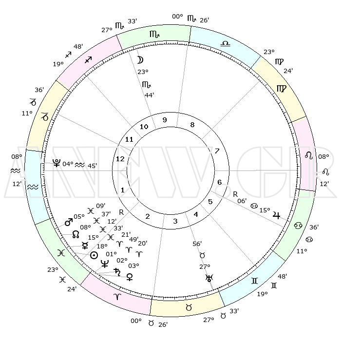 | | ΘΕΣΕΙΣ ΠΛΑΝΗΤΩΝ ΑΣΤΡΟΛΟΓΙΚΟΥ ΧΑΡΤΗ ΤΗΣ ΣΤΙΓΜΗΣ ΑΥΤΗΣ | | | | Πλανήτης | Ζώδιο | Μοίρες | Δεκαήμ. | Σε οίκο | Απόκλιση | | Ακμές των οίκων | | Ηλιος | Ιχθείς | 17°52' | Δεύτερο | 10 | 04 S 48 | | 1ος | 04°23' | Καρκίνος | | Σελήνη | Σκορπιός | 15°25' | Δεύτερο | 5 | 21 S 04 | | 2ος | 24°57' | Καρκίνος | | Ερμής | Ιχθείς | 15°54'R | Δεύτερο | 10 | 02 S 16 | | 3ος | 17°04' | Λέων | | Αφροδίτη | Κριός | 02°29' | Πρώτο | 10 | 00 S 08 | | 4ος | 14°06' | Παρθένος | | Αρης | Ιχθείς | 04°37' | Πρώτο | 9 | 10 S 50 | | 5ος | 18°41' | Ζυγός | | Δίας | Καρκίνος | 15°06'R | Δεύτερο | 1 | 22 N 56 | | 6ος | 28°18' | Σκορπιός | | Κρόνος | Κριός | 02°44' | Πρώτο | 10 | 00 S 52 | | 7ος | 04°23' | Αιγόκερως | | Ουρανός | Ταύρος | 27°55' | Τρίτο | 11 | 19 N 31 | | 8ος | 24°57' | Αιγόκερως | | Ποσειδώνας | Κριός | 01°19' | Πρώτο | 10 | 00 S 40 | | 9ος | 17°04' | Υδροχόος | | Πλούτωνας | Υδροχόος | 04°44' | Πρώτο | 8 | 22 S 51 | | 10ος | 14°06' | Ιχθείς | | Β. Δεσμός | Ιχθείς | 08°39' | Πρώτο | 9 | 08 S 19 | | 11ος | 18°41' | Κριός | | Ωροσκόπος | Καρκίνος | 04°23' | Πρώτο | | | 12ος | 28°18' | Ταύρος | | Μεσουράνημα | Ιχθείς | 14°06' | Δεύτερο | | | |