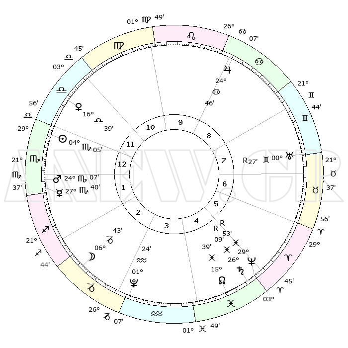 | | ΘΕΣΕΙΣ ΠΛΑΝΗΤΩΝ ΑΣΤΡΟΛΟΓΙΚΟΥ ΧΑΡΤΗ ΤΗΣ ΣΤΙΓΜΗΣ ΑΥΤΗΣ | | | | Πλανήτης | Ζώδιο | Μοίρες | Δεκαήμ. | Σε οίκο | Απόκλιση | | Ακμές των οίκων | | Ηλιος | Σκορπιός | 03°59' | Πρώτο | 1 | 12 S 51 | | 1ος | 21°59' | Ζυγός | | Σελήνη | Αιγόκερως | 05°29' | Πρώτο | 3 | 28 S 11 | | 2ος | 19°56' | Σκορπιός | | Ερμής | Σκορπιός | 27°33' | Τρίτο | 2 | 22 S 17 | | 3ος | 21°20' | Τοξότης | | Αφροδίτη | Ζυγός | 16°32' | Δεύτερο | 12 | 05 S 06 | | 4ος | 25°02' | Αιγόκερως | | Αρης | Σκορπιός | 24°02' | Τρίτο | 2 | 19 S 07 | | 5ος | 27°59' | Υδροχόος | | Δίας | Καρκίνος | 24°46' | Τρίτο | 9 | 21 N 15 | | 6ος | 27°18' | Ιχθείς | | Κρόνος | Ιχθείς | 26°10'R | Τρίτο | 5 | 03 S 48 | | 7ος | 21°59' | Κριός | | Ουρανός | Δίδυμοι | 00°27'R | Πρώτο | 8 | 20 N 02 | | 8ος | 19°56' | Ταύρος | | Ποσειδώνας | Ιχθείς | 29°53'R | Τρίτο | 6 | 01 S 18 | | 9ος | 21°20' | Δίδυμοι | | Πλούτωνας | Υδροχόος | 01°24' | Πρώτο | 4 | 23 S 31 | | 10ος | 25°02' | Καρκίνος | | Β. Δεσμός | Ιχθείς | 15°39' | Δεύτερο | 5 | 05 S 39 | | 11ος | 27°59' | Λέων | | Ωροσκόπος | Ζυγός | 21°59' | Τρίτο | | | 12ος | 27°18' | Παρθένος | | Μεσουράνημα | Καρκίνος | 25°02' | Τρίτο | | | |