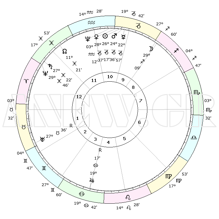 | | ΘΕΣΕΙΣ ΠΛΑΝΗΤΩΝ ΑΣΤΡΟΛΟΓΙΚΟΥ ΧΑΡΤΗ ΤΗΣ ΣΤΙΓΜΗΣ ΑΥΤΗΣ | | | | Πλανήτης | Ζώδιο | Μοίρες | Δεκαήμ. | Σε οίκο | Απόκλιση | | Ακμές των οίκων | | Ηλιος | Αιγόκερως | 26°13' | Τρίτο | 11 | 20 S 54 | | 1ος | 23°53' | Ιχθείς | | Σελήνη | Τοξότης | 28°19' | Τρίτο | 10 | 28 S 17 | | 2ος | 05°35' | Ταύρος | | Ερμής | Αιγόκερως | 22°51' | Τρίτο | 11 | 23 S 20 | | 3ος | 03°57' | Δίδυμοι | | Αφροδίτη | Αιγόκερως | 28°32' | Τρίτο | 11 | 21 S 27 | | 4ος | 26°34' | Δίδυμοι | | Αρης | Αιγόκερως | 24°32' | Τρίτο | 11 | 22 S 10 | | 5ος | 18°38' | Καρκίνος | | Δίας | Καρκίνος | 19°18'R | Δεύτερο | 5 | 22 N 19 | | 6ος | 15°07' | Λέων | | Κρόνος | Ιχθείς | 27°21' | Τρίτο | 1 | 03 S 05 | | 7ος | 23°53' | Παρθένος | | Ουρανός | Ταύρος | 27°36'R | Τρίτο | 2 | 19 N 26 | | 8ος | 05°35' | Σκορπιός | | Ποσειδώνας | Ιχθείς | 29°46' | Τρίτο | 1 | 01 S 18 | | 9ος | 03°57' | Τοξότης | | Πλούτωνας | Υδροχόος | 03°12' | Πρώτο | 11 | 23 S 07 | | 10ος | 26°34' | Τοξότης | | Β. Δεσμός | Ιχθείς | 11°21' | Δεύτερο | 12 | 07 S 18 | | 11ος | 18°38' | Αιγόκερως | | Ωροσκόπος | Ιχθείς | 23°53' | Τρίτο | | | 12ος | 15°07' | Υδροχόος | | Μεσουράνημα | Τοξότης | 26°34' | Τρίτο | | | |