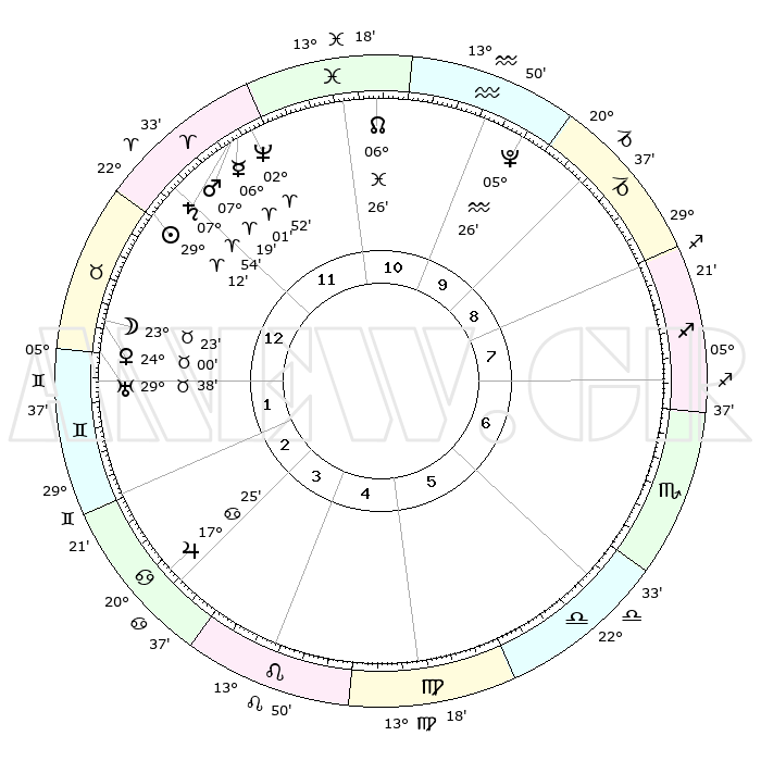 | | ΘΕΣΕΙΣ ΠΛΑΝΗΤΩΝ ΑΣΤΡΟΛΟΓΙΚΟΥ ΧΑΡΤΗ ΤΗΣ ΣΤΙΓΜΗΣ ΑΥΤΗΣ | | | | Πλανήτης | Ζώδιο | Μοίρες | Δεκαήμ. | Σε οίκο | Απόκλιση | | Ακμές των οίκων | | Ηλιος | Κριός | 29°08' | Τρίτο | 12 | 11 N 10 | | 1ος | 09°09' | Ταύρος | | Σελήνη | Ταύρος | 22°31' | Τρίτο | 1 | 23 N 09 | | 2ος | 08°54' | Δίδυμοι | | Ερμής | Κριός | 05°56' | Πρώτο | 12 | 00 S 04 | | 3ος | 01°36' | Καρκίνος | | Αφροδίτη | Ταύρος | 23°56' | Τρίτο | 1 | 19 N 06 | | 4ος | 23°24' | Καρκίνος | | Αρης | Κριός | 07°17' | Πρώτο | 12 | 02 N 00 | | 5ος | 18°48' | Λέων | | Δίας | Καρκίνος | 17°25' | Δεύτερο | 3 | 22 N 41 | | 6ος | 23°21' | Παρθένος | | Κρόνος | Κριός | 07°53' | Πρώτο | 12 | 01 N 09 | | 7ος | 09°09' | Σκορπιός | | Ουρανός | Ταύρος | 29°38' | Τρίτο | 1 | 19 N 54 | | 8ος | 08°54' | Τοξότης | | Ποσειδώνας | Κριός | 02°52' | Πρώτο | 12 | 00 S 04 | | 9ος | 01°36' | Αιγόκερως | | Πλούτωνας | Υδροχόος | 05°26' | Πρώτο | 10 | 22 S 47 | | 10ος | 23°24' | Αιγόκερως | | Β. Δεσμός | Ιχθείς | 06°26' | Πρώτο | 11 | 09 S 09 | | 11ος | 18°48' | Υδροχόος | | Ωροσκόπος | Ταύρος | 09°09' | Πρώτο | | | 12ος | 23°21' | Ιχθείς | | Μεσουράνημα | Αιγόκερως | 23°24' | Τρίτο | | | |