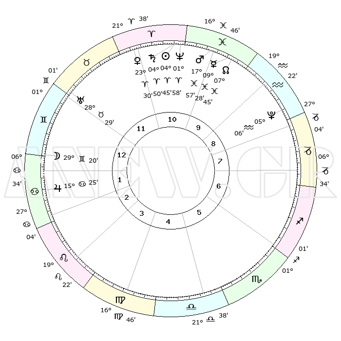 | | ΘΕΣΕΙΣ ΠΛΑΝΗΤΩΝ ΑΣΤΡΟΛΟΓΙΚΟΥ ΧΑΡΤΗ ΤΗΣ ΣΤΙΓΜΗΣ ΑΥΤΗΣ | | | | Πλανήτης | Ζώδιο | Μοίρες | Δεκαήμ. | Σε οίκο | Απόκλιση | | Ακμές των οίκων | | Ηλιος | Κριός | 04°41' | Πρώτο | 11 | 01 N 52 | | 1ος | 13°08' | Δίδυμοι | | Σελήνη | Δίδυμοι | 28°22' | Τρίτο | 1 | 28 N 21 | | 2ος | 05°39' | Καρκίνος | | Ερμής | Ιχθείς | 09°26' | Πρώτο | 10 | 08 S 05 | | 3ος | 26°52' | Καρκίνος | | Αφροδίτη | Κριός | 23°25' | Τρίτο | 11 | 08 N 26 | | 4ος | 20°52' | Λέων | | Αρης | Ιχθείς | 17°54' | Δεύτερο | 10 | 05 S 46 | | 5ος | 21°44' | Παρθένος | | Δίας | Καρκίνος | 15°25' | Δεύτερο | 2 | 22 N 54 | | 6ος | 01°44' | Σκορπιός | | Κρόνος | Κριός | 04°50' | Πρώτο | 11 | 00 S 02 | | 7ος | 13°08' | Τοξότης | | Ουρανός | Ταύρος | 28°29' | Τρίτο | 12 | 19 N 39 | | 8ος | 05°39' | Αιγόκερως | | Ποσειδώνας | Κριός | 01°57' | Πρώτο | 11 | 00 S 25 | | 9ος | 26°52' | Αιγόκερως | | Πλούτωνας | Υδροχόος | 05°06' | Πρώτο | 9 | 22 S 48 | | 10ος | 20°52' | Υδροχόος | | Β. Δεσμός | Ιχθείς | 07°45' | Πρώτο | 10 | 08 S 39 | | 11ος | 21°44' | Ιχθείς | | Ωροσκόπος | Δίδυμοι | 13°08' | Δεύτερο | | | 12ος | 01°44' | Ταύρος | | Μεσουράνημα | Υδροχόος | 20°52' | Τρίτο | | | |